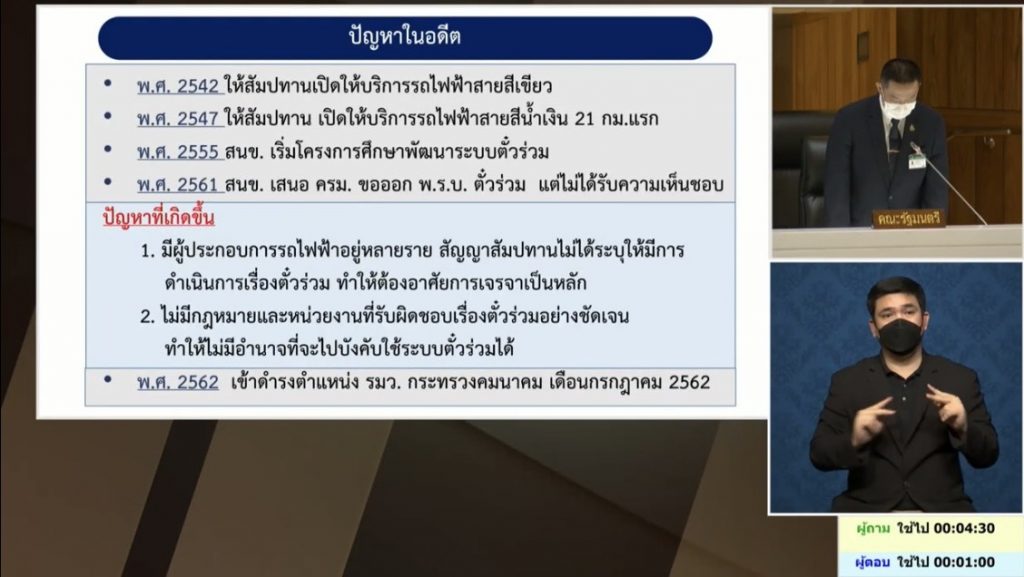 นายศักดิ์สยาม ชิดชอบ รัฐมนตรีว่าการ กระทรวงคมนาคม ได้ตอบกระทู้ต่อสภาผู้แทนราษฎร ตามที่ นายสมเกียรติ ถนอมสินธุ์ สมาชิกสภาผู้แทนราษฎร กทม. พรรคก้าวไกล ได้ตั้งกระทู้ถาม เกี่ยวกับความคืบหน้าระบบตั๋วร่วม งบประมาณที่ใช้ในการพัฒนาระบบตั๋วร่วมที่ผ่านมา และการพัฒนาระบบตั๋วร่วม EMV Contactless (Europay Mastercard and Visa) ที่กระทรวงคมนาคม ดำเนินการอยู่