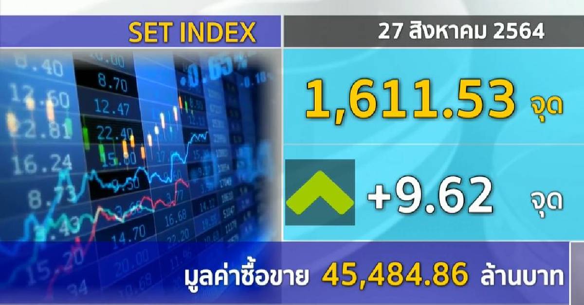 กทม. 27 ส.ค.-ตลาดหุ้นไทยเปิดตลาดเช้าวันนี้ ดัชนีอยู่ที่ 1,600 กว่าจุด แต่ดัชนีช่วงเที่ยงอยู่ที่ 1,611.53 จุด เพิ่มขึ้นไป 9.62 จุด มูลค่าซื้อขาย 45,484.86 ล้านบาท
