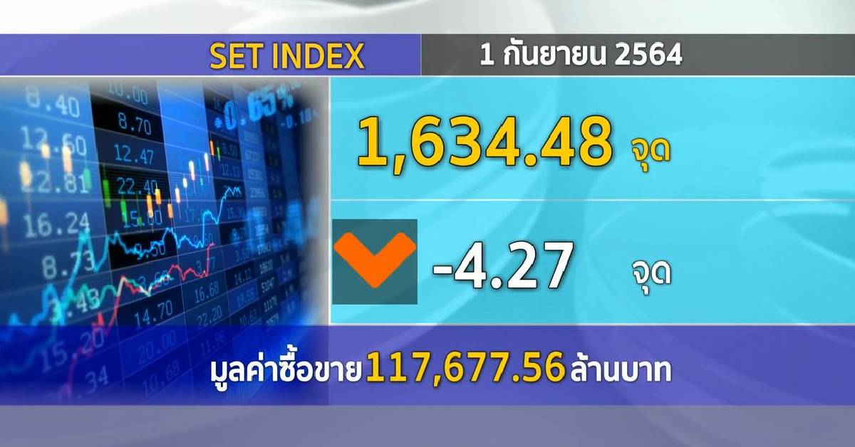 กทม. 1 ก.ย.-ตลาดหลักทรัพย์ ปิดวันนี้ที่ระดับ 1,634.48 จุด ลดลง 4.27 จุด (-0.26%) มูลค่าการซื้อขาย 117,677.56 ล้านบาท หุ้นไทยอ่อนตัวลงระยะสั้น หลังขึ้นไปทดสอบระดับสูงสุดเดิมแล้วไม่ผ่าน จึงเป็นจังหวะพักตัว