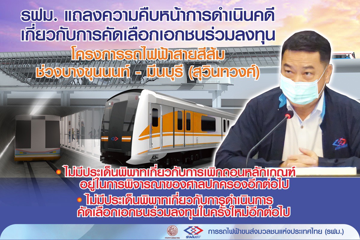 นายภคพงศ์ ศิริกันทรมาศ ผู้ว่าการการรถไฟฟ้าขนส่งมวลชนแห่งประเทศไทย (รฟม.) เปิดเผยว่า ช่วงเช้าวันนี้ (1 ก.ย.) ศาลปกครองสูงสุด มีคำสั่งยืนตามคำสั่งศาลปกครองชั้นต้น ไม่รับคำฟ้องของผู้ฟ้องคดีตามที่บริษัท ระบบขนส่งมวลชนกรุงเทพ จำกัด (มหาชน) หรือ BTSC ฟ้องร้อง คณะกรรมการมาตรา 36 และ รฟม. กระทำการหรือดำเนินการใดๆ ที่เกี่ยวข้องกับการคัดเลือกเอกชนในโครงการรถไฟฟ้าสายสีส้ม ช่วงบางขุนนนท์-มีนบุรี (สุวินทวงศ์)