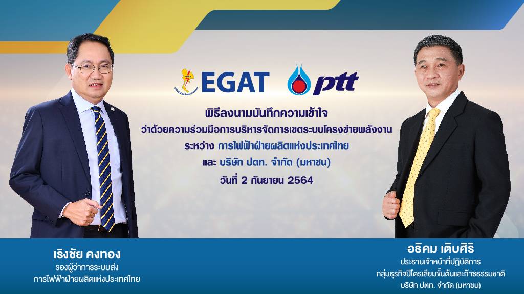 นายอธิคม เติบศิริ ประธานเจ้าหน้าที่ปฏิบัติการกลุ่มธุรกิจปิโตรเลียมขั้นต้นและก๊าซธรรมชาติ บริษัท ปตท. จำกัด (มหาชน) (ปตท.) และ นายเริงชัย คงทอง รองผู้ว่าการระบบส่ง การไฟฟ้าฝ่ายผลิตแห่งประเทศไทย (กฟผ.) ลงนามในบันทึกความเข้าใจในวันนี้ (2ก.ย.) ว่าด้วยความร่วมมือการบริหารจัดการเขตระบบโครงข่ายพลังงาน ระหว่าง ปตท. และ กฟผ.