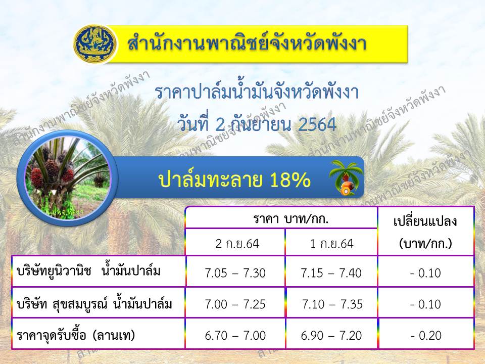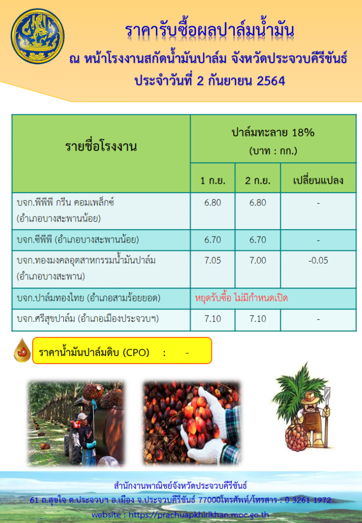 นางมัลลิกา บุญมีตระกูล มหาสุข ที่ปรึกษารัฐมนตรีว่าการกระทรวงพาณิชย์กล่าวว่า กรมการค้าภายในได้รายงานราคาผลปาล์มทะลายอัตราน้ำมัน 18% จากแหล่งผลิตสำคัญ จังหวัดสุราษฎร์ธานี กระบี่และชุมพรในวันที่ 2 ก.ย.64 เฉลี่ยอยู่ที่กิโลกรัมละ 6.75 บาท ส่งผลให้ราคาน้ำมันปาล์มดิบเฉลี่ยกิโลกรัมละ 36.38 บาท สูงขึ้นจากช่วงเดียวกันของปีก่อนซึ่งอยู่ที่เฉลี่ยกิโลกรัมละ 3.75 บาทและ 20.50 บาทตามลำดับ โดยวันที่ 30 ส.ค. 64 เกษตรกรที่ขายผลปาล์มคุณภาพดีสามารถขายผลปาล์มได้สูงถึง 7.40 บาทถือว่าเกษตรกรขายผลปาล์มดิบอยู่ในเกณฑ์ราคาที่ดีอย่างต่อเนื่อง