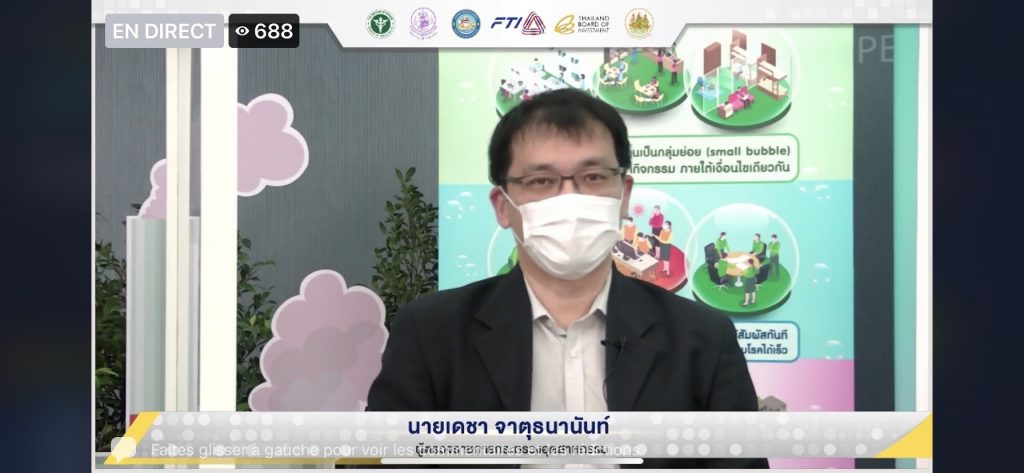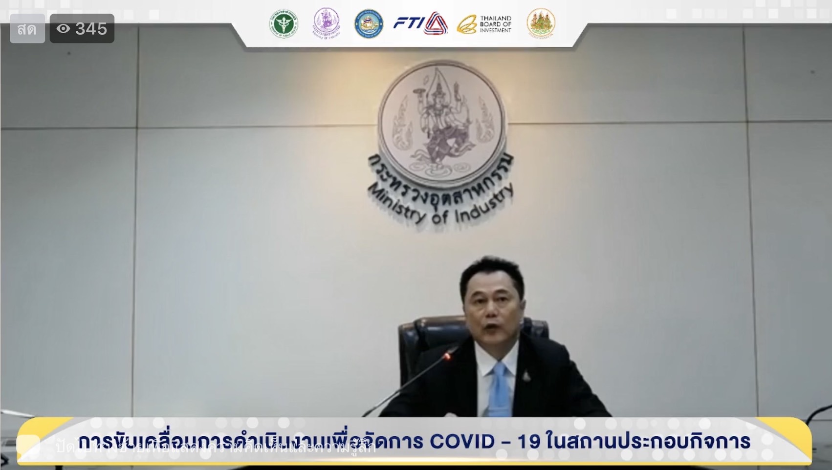 “ปัจจุบันแม้ว่าสถานการณ์การระบาดของ COVID-19 ในประเทศไทยจะมีแนวโน้มดีขึ้น แต่ก็ยังคงพบการระบาดในสถานประกอบการอย่างต่อเนื่อง ซึ่งหากผู้ประกอบการไม่ให้ความสำคัญกับมาตรการป้องกันและควบคุมการแพร่กระจายของเชื้อไวรัสโคโรนา 2019 จะทำให้สถานการณ์การระบาดของ COVID-19 ในประเทศไทยกลับลงมาแย่ลงได้อีกและอาจมีโรงงานต้องหยุดประกอบกิจการชั่วคราวเพิ่มขึ้นอีก จึงมีความจำเป็น ที่ทั้งภาครัฐและเอกชนต้องช่วยกันและร่วมมือกัน เพื่อหยุดการระบาดของ COVID-19 ในโรงงาน และเพื่อให้มาตรการป้องกันและควบคุมการแพร่กระจายเชื้อไวรัสโคโรนา 2019 ในสถานประกอบกิจการโรงงานสามารถนำไปปฏิบัติได้เหมาะสมกับโรงงานมากขึ้น ซึ่งการเสวนาในวันนี้จะก่อให้เกิดประโยชน์กับผู้ประกอบการ ในการปรับตัวในสถานการณ์การแพร่ระบาดในโรงงาน” ปลัดกระทรวงอุตสาหกรรม กล่าว