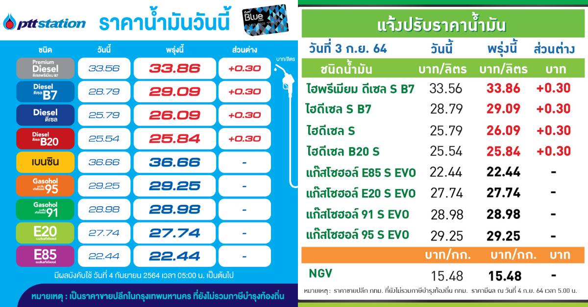 กทม. 3 ก.ย.-PTT Station บางจากฯ ปรับราคาขายปลีกน้ำมันกลุ่มดีเซลทุกชนิดขึ้น 0.30 บาทต่อลิตร ส่วนกลุ่มเบนซินและแก๊สโซฮอล์ทุกชนิดคงเดิม มีผล 4 ก.ย.64 เวลา 05.00 น. เป็นต้นไป