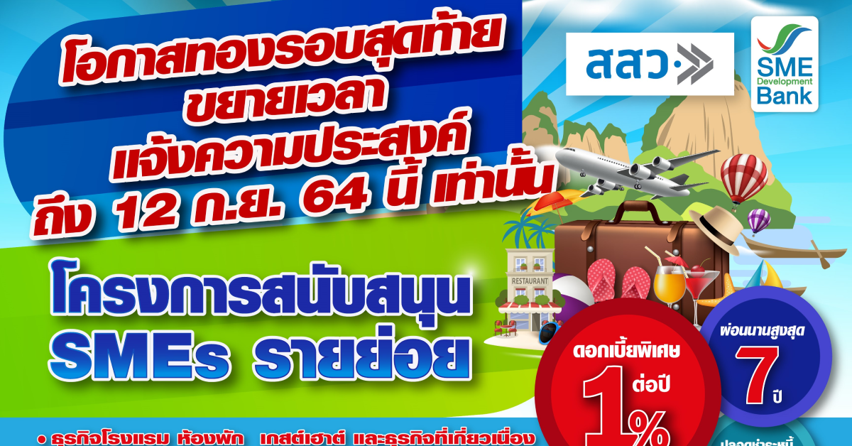 สำนักงานส่งเสริมวิสาหกิจขนาดกลางและขนาดย่อม (สสว.) และ ธนาคารพัฒนาวิสาหกิจขนาดกลางและขนาดย่อมแห่งประเทศไทย (ธพว.) หรือ SME D Bank ในฐานะหน่วยร่วมดำเนิน “โครงการสนับสนุน SMEs รายย่อย” วงเงินรวม 1,200 ล้านบาท ขยายระยะเวลาแจ้งความประสงค์ยื่นกู้ออกไปจนถึงภายในวันที่ 12 กันยายน 2564 นี้ เพื่อเปิดโอกาสให้ผู้ประกอบการเอสเอ็มอีที่ได้รับผลกระทบจากการแพร่ระบาดของโควิด-19 เข้าถึงแหล่งเงินทุน ดอกเบี้ยพิเศษ 1% ต่อปี ผ่อนนานสูงสุด 7 ปี ปลอดชำระคืนเงินต้นสูงสุด 12 เดือน วงเงินกู้ บุคคลธรรมดา สูงสุด 3 แสนบาท นิติบุคคล สูงสุด 5 แสนบาท สำหรับกลุ่มเป้าหมายธุรกิจโรงแรม ห้องพัก เกสต์เฮาต์ และธุรกิจที่เกี่ยวเนื่องกับการท่องเที่ยว (Supply Chain) ได้แก่ ธุรกิจนำเที่ยว-ทัวร์ ธุรกิจคมนาคมขนส่ง ธุรกิจสปา และธุรกิจค้าส่งค้าปลีก จำหน่ายสินค้าที่ระลึก ธุรกิจนันทนาการ และธุรกิจเพื่อความบันเทิง รวมถึง ธุรกิจภัตตาคาร ร้านอาหาร และธุรกิจที่เกี่ยวเนื่องกับอาหาร ได้แก่ เครื่องดื่ม ร้านกาแฟ ขนม เบเกอรี่ เป็นต้น ซึ่งตั้งอยู่ในพื้นที่จังหวัดนำร่องเปิดการท่องเที่ยว และจังหวัดพื้นที่ควบคุมสูงสุดและเข้มงวด รวม 35 จังหวัด หรือที่จะมีประกาศเพิ่มเติมในอนาคต โดยใช้เกณฑ์การพิจารณาจากหลักฐานแบบแสดงการยื่นภาษี ภ.ง.ด.90 และการชำระภาษี ในปี 2562 หรือ 2563 ที่สูงกว่าเป็นฐาน ช่วยให้เข้าถึงแหล่งทุนได้ง่าย