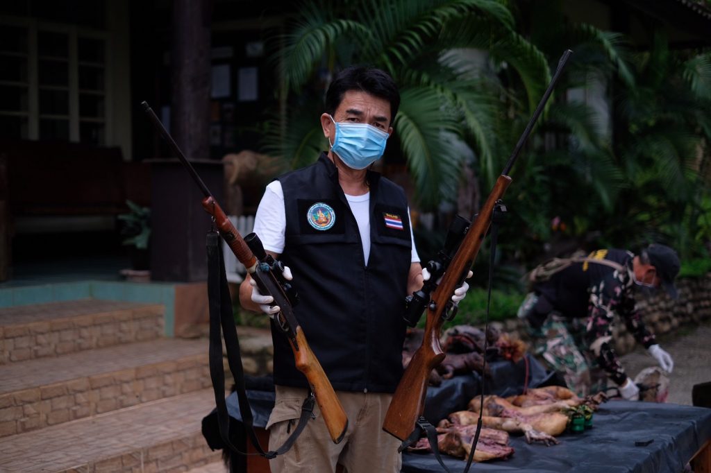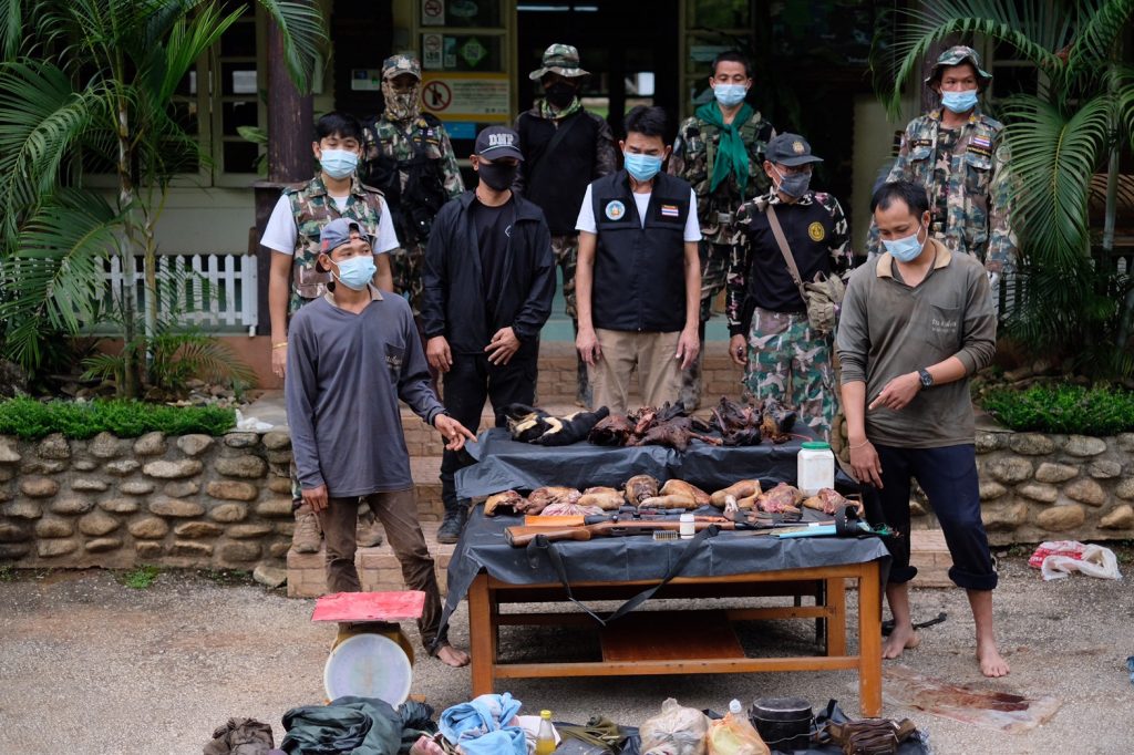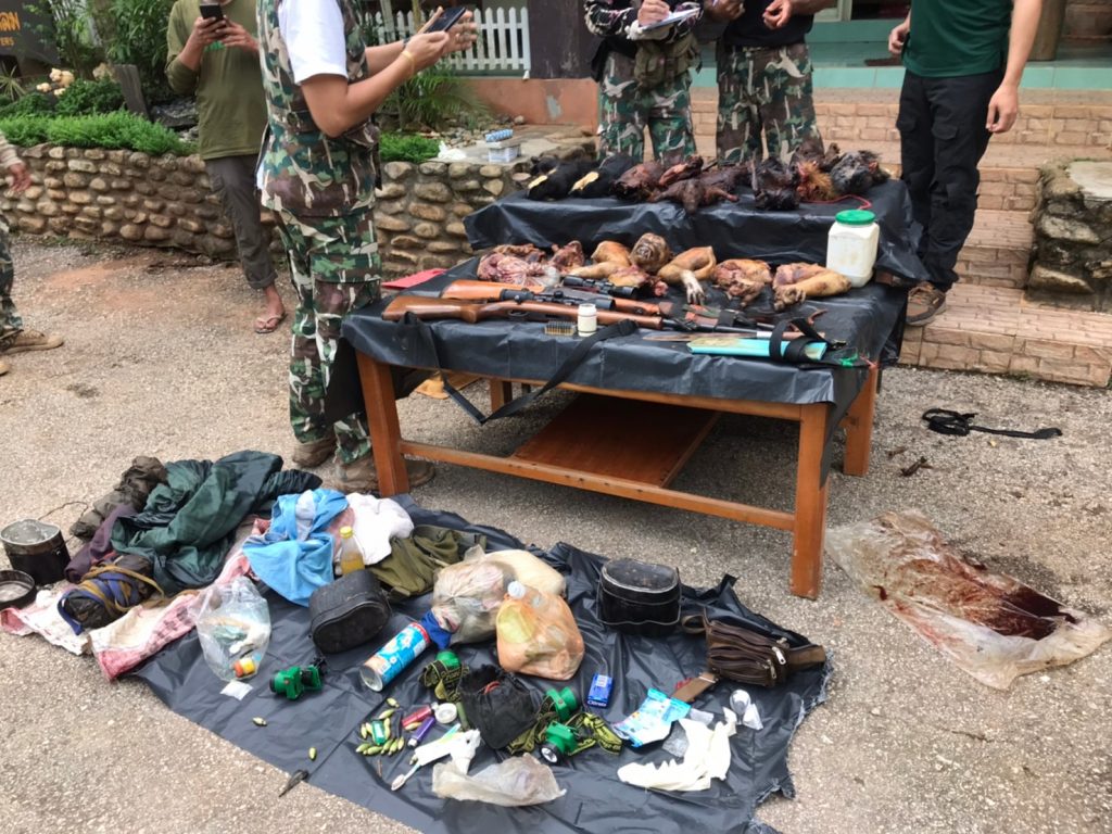 ภายในถุงปุ๋ยมีซากสัตว์ป่าได้แก่ กระรอกดง 2 ตัว นกเงือก 2 ตัว เม่นหางพวง 2 ตัว ค่างชำแหละรมควันเป็นชิ้น 1 ซาก ลิงชำแหละเป็นชิ้น 1 ซาก ตะพาบน้ำ 1 ซาก และตะกวด 1 ซาก พร้อมอุปกรณ์ล่าสัตว์คือ ปืน CZ 452 .22 LR พร้อมกล้องเล็งติดปืน 1 กระบอก กระสุนปืน 75 นัด และแม็กกาซีนปืน 1 ชุด ปืนไทยประดิษฐ์ .22 พร้อมกล้องเล็งติดปืน 1 กระบอก มีดปลายแหลม 3 เล่ม ไฟคาดหัว 4 ดวง ไฟฉาย 1 กระบอก หม้อสนาม 4 ใบ เปลนอน 3 หลัง ไฟแช็ค 4 อัน เตาแก๊สพร้อมแก๊สกระป๋อง 1 ชุด และเป้สะพายหลัง 1 ใบ