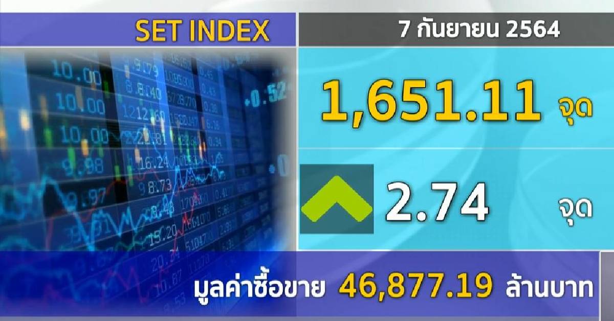 กทม. 7 ก.ย.-หุ้นไทยเช้านี้สดใส เคลื่อนไหวที่ 1,651.11 จุด เพิ่มขึ้น 2.74 จุด มูลค่าซื้อขาย 46,877.19 ล้านบาท แรงซื้อจากความคาดหวัง 10 กันยายน นี้ ศบค. จะยกเลิกการใช้ พ.ร.ก.ฉุกเฉิน และยุบ ศบค. หลังตัวเลขผู้ติดเชื้อโควิด-19 ลดลง รวมถึงดัชนีความเชื่อมั่นลงทุนพุ่งขึ้น