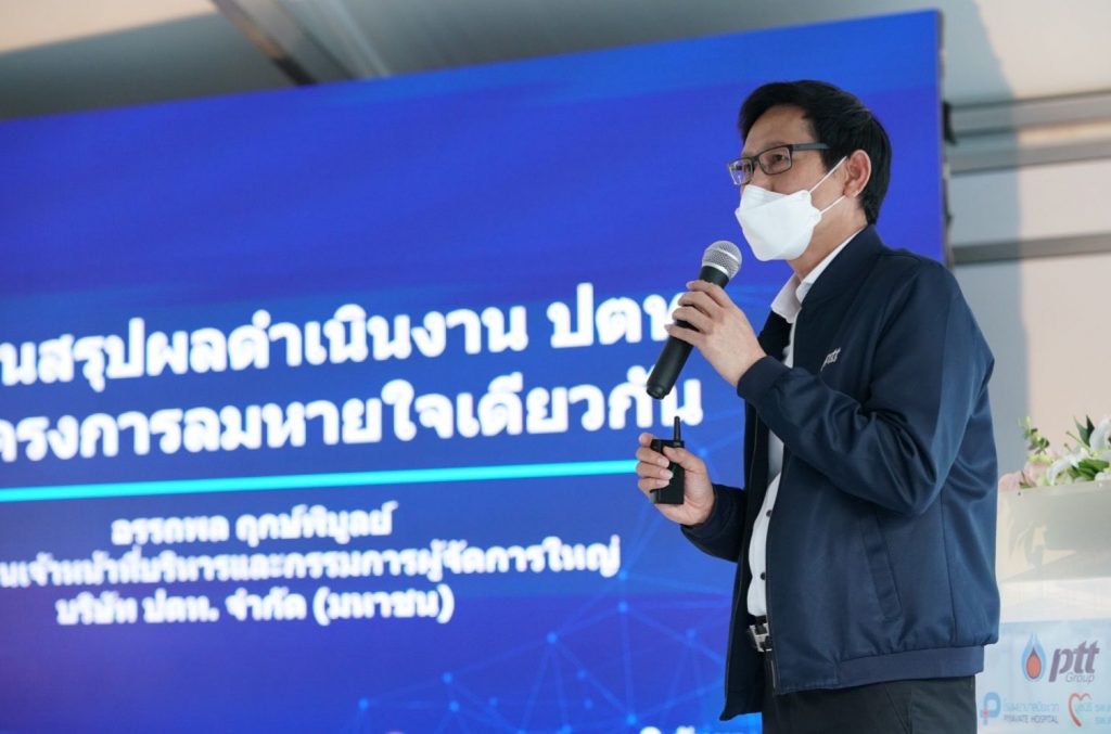 นายอรรถพล กล่าวว่า กลุ่ม ปตท. ตระหนักถึงความสำคัญเร่งด่วนในการร่วมแก้ปัญหาโควิด-19 ซึ่งเป็นวิกฤตใหญ่ของประเทศ โดยตั้งแต่มกราคม 2563 ถึงปัจจุบัน กลุ่ม ปตท. ได้จัดสรรงบประมาณกว่า 1,700 ล้านบาท เพื่อช่วยบรรเทาสถานการณ์ความรุนแรงในหลายด้าน จนนำมาสู่การจัดตั้ง “โครงการลมหายใจเดียวกัน” ขึ้นในปี 2564 เพื่อแบ่งเบาภาระของภาครัฐ และร่วมดูแลประชาชน โดยเฉพาะการมอบเครื่องช่วยหายใจ ออกซิเจนเหลว อุปกรณ์ทางการแพทย์ที่จำเป็น ให้แก่โรงพยาบาลต่าง ๆ ทั่วประเทศ และในขณะนี้ที่สถานการณ์ยังไม่คลี่คลาย กลุ่ม ปตท. เล็งเห็นถึงความสำคัญของการผนึกพลังกับภาครัฐและเอกชน ในการหยุดยั้งการแพร่ระบาดของเชื้อโควิด-19 มุ่งตรวจเร็ว แยกเร็ว รักษาเร็ว เพื่อให้ประชาชนผ่านพ้นช่วงเวลาที่ยากลำบากเหล่านี้ไปให้ได้ จึงได้จัดตั้งหน่วยคัดกรองโควิด-19 เปิดคัดกรองเฉลี่ยวันละ 1,000 – 1,200 คน เมื่อพบว่าติดเชื้อจะคัดแยกและให้ยารักษาทันที และจัดตั้งโรงพยาบาลสนามครบวงจร (End-to-End) สร้างความอุ่นใจแก่ประชาชนโดยไม่คิดค่าใช้จ่าย ตั้งแต่วันที่ 9 สิงหาคม 2564 โดยวางระบบ Home Isolation และโรงพยาบาลสนาม (Hospitel) สีเขียว 1,000 เตียง สีเหลือง 300 เตียง และจัดตั้ง “โรงพยาบาลสนาม ICU” 120 เตียง ถือเป็น ICU สนามที่ใหญ่ที่สุดในประเทศ ที่มีความสำคัญยิ่งในการช่วยลดการเสียชีวิตของประชาชน ด้วยความร่วมมือของพันธมิตรทุกภาคส่วน ผนวกกับความร่วมมือด้านนวัตกรรมและเทคโนโลยีของกลุ่ม ปตท. ทำให้สามารถดูแลผู้ป่วยและสนับสนุนบุคลากรทางการแพทย์ได้อย่างเต็มประสิทธิภาพยิ่งขึ้น