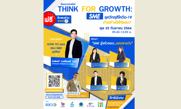 สำนักงานส่งเสริมวิสาหกิจขนาดกลางและขนาดย่อม (สสว.) กรมส่งเสริมอุตสาหกรรม (กสอ.) บมจ.ซีพี ออลล์ ธนาคารพัฒนาวิสาหกิจขนาดกลางและขนาดย่อมแห่งประเทศไทย (SME D Bank) และสมาคมการค้าปลีกและเอสเอ็มอีทุนไทย จัดสัมมนาออนไลน์ผ่าน Zoom ในหัวข้อ “Think for Growth : SME ยุควิกฤติโควิด-19…ทำอย่างไรให้รอด” เพื่อช่วยต่อยอดแนวคิดให้ SME ไทยสามารถปรับตัวและพัฒนาธุรกิจในยุคโควิดผ่านองค์ความรู้จากกูรูด้านต่างๆ ในวันพุธที่ 22 กันยายนนี้ เวลา 09.45-12.00 น.