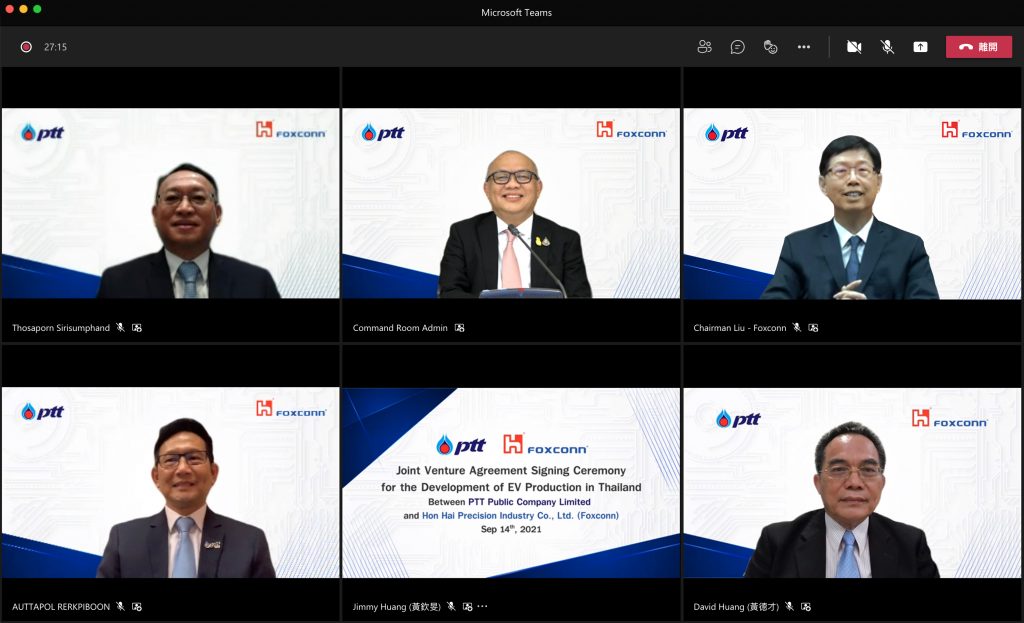 กรุงเทพฯ 14 ก.ย.-ปตท.ลงนามร่วมทุน ฟ็อกซ์คอนน์ เตรียมจัดตั้งโรงงานผลิตยานยนต์ไฟฟ้าครบวงจร พร้อมดันไทยสู่ศูนย์กลางอาเซียน เล็งพื้นที่ EEC สร้างโรงงานใหม่ วางระบบการผลิต การบริหาร Supply chain พร้อมตั้งศูนย์วิจัยและพัฒนาทางวิศวกรรม ด้วยเงินลงทุน 1 – 2 พันล้านเหรียญสหรัฐฯ