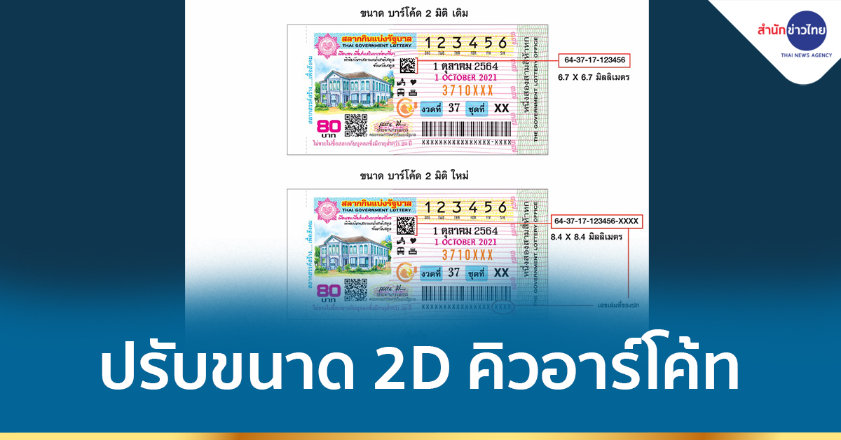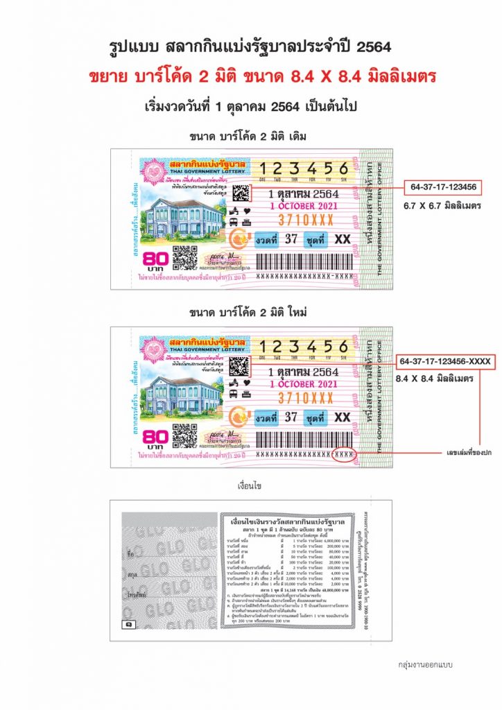 พันโท หนุน ศันสนาคม ผู้อำนวยการสำนักงานสลากกินแบ่งรัฐบาล กล่าวว่า สำนักงานสลากกินแบ่งรัฐบาล ได้ปรับขนาด 2D บาร์โค้ดบนใบสลากให้มีขนาดใหญ่ขึ้น เริ่มตั้งแต่งวดวันที่ 1 ตุลาคม 2564 เป็นต้นไป เพื่อเพิ่มความสะดวกให้กับผู้รับซื้อรางวัลและประชาชนให้สามารถตรวจสอบสลากได้ง่ายและสะดวกมากยิ่งขึ้น ผ่านแอปพลิเคชัน Glo Lottery Official แนะนำให้ อัปเดตเวอร์ชั่นทุกครั้ง และขอให้ประชาชนผู้ซื้อสลากทำการตรวจพิสูจน์สลากเบื้องต้น ณ จุดขายอย่างละเอียดรอบคอบ ตามวิธีการที่สำนักงานสลากแนะนำ