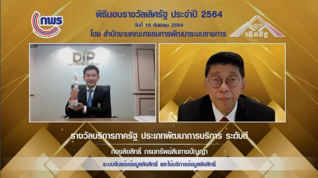 นนทบุรี 17 ก.ย.-กรมทรัพย์สินทางปัญญา คว้ารางวัลเลิศรัฐ ประจำปี 2564 สาขาบริการภาครัฐ ทางด้าน “ระบบรับแจ้งข้อมูลลิขสิทธิ์และใช้บริการข้อมูลลิขสิทธิ์”