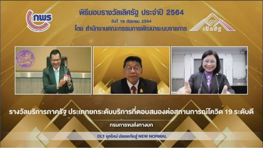 กรุงเทพฯ 17 ก.ย.- กรมการขนส่งทางบก คว้ารางวัลเลิศรัฐ ประจำปี 2564 จากสำนักงาน ก.พ.ร. ตอกย้ำ ผลงาน “DLT ยุคใหม่ ปลอดภัยสู่ NEW NORMAL” ยกระดับบริการที่ตอบสนองต่อสถานการณ์โควิด 19 ประชาชนได้รับบริการที่สะดวก รวดเร็ว ปลอดภัย