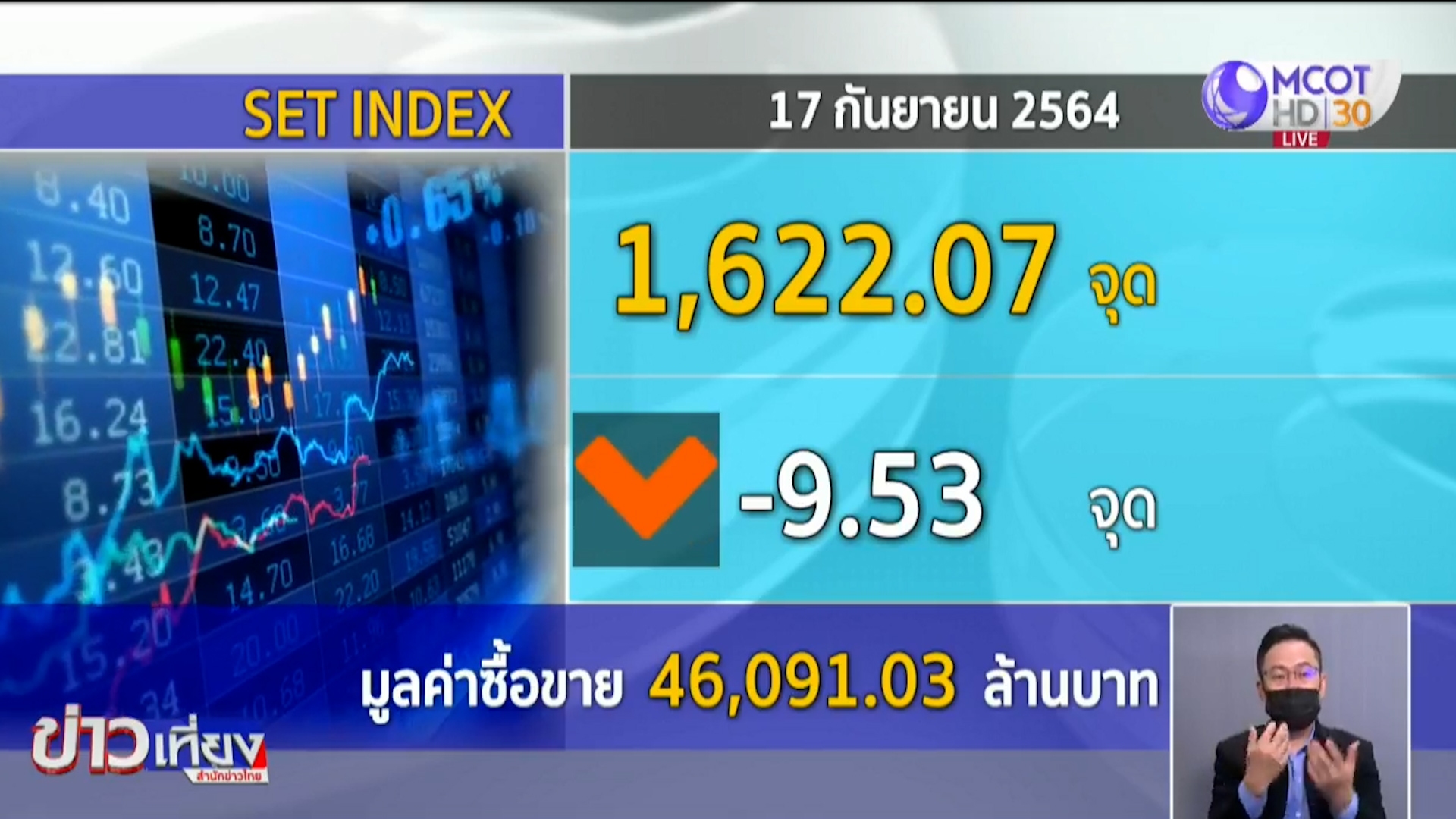 กทม. 17 ก.ย.-ตลาดหุ้นไทยภาคเช้าร่วง กว่า 10 จุด รับแรงขายหุ้นขนาดใหญ่ลดความเสี่ยงก่อนเข้าสู่วันหยุดสุดสัปดาห์ หลังจำนวนผู้ติดเชื้อโควิดในประเทศวันนี้กลับมาปรับตัวสูงขึ้น ดัชนีช่วงเที่ยงอยู่ที่ 1,622.07 จุด -9.53 จุด มูลค่าการซื้อขาย 46,091.03 ล้านบาท