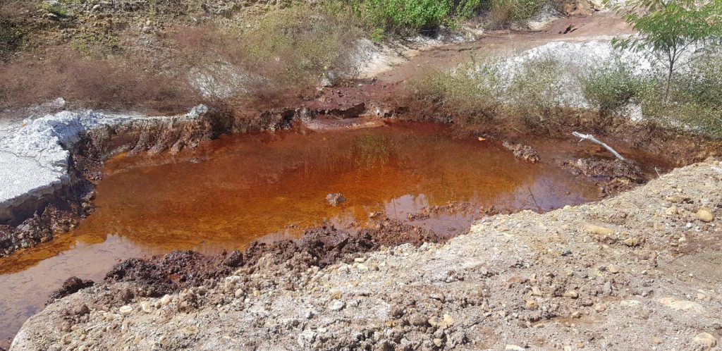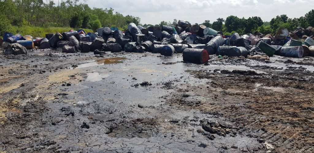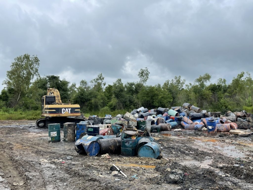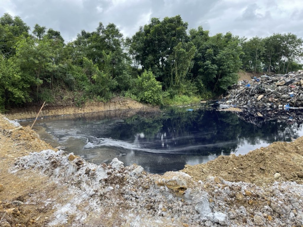 สำหรับพื้นที่ที่มีการลักลอบทิ้งของเสียเคมี รวมถึงวัสดุที่ไม่ใช้แล้ว ซึ่งเป็นกากอุตสาหกรรม เป็นพื้นที่ของเอกชนมีประมาณ 3 – 4 ไร่ จากพื้นที่ทั้งหมด 24 ไร่ พบว่ามีการนำถังบรรจุของเสียเคมีหรือวัสดุที่ไม่ใช้แล้วขนาด 200 ลิตร ประมาณ 300-400 ถัง มาทิ้งในบ่อดินเก่า โดยลักษณะของถังที่ตรวจพบมีการบีบอัดจนสิ่งปฏิกูลหรือวัสดุที่ไม่ใช้แล้วเจิ่งนองไปทั่วบริเวณโดยรอบ ทั้งนี้ ลักษณะทางกายภาพของของเสียเคมีหรือวัสดุที่ไม่ใช้แล้วบางส่วนเข้าข่ายเป็นของเสียอันตราย เพราะสามารถติดไฟได้