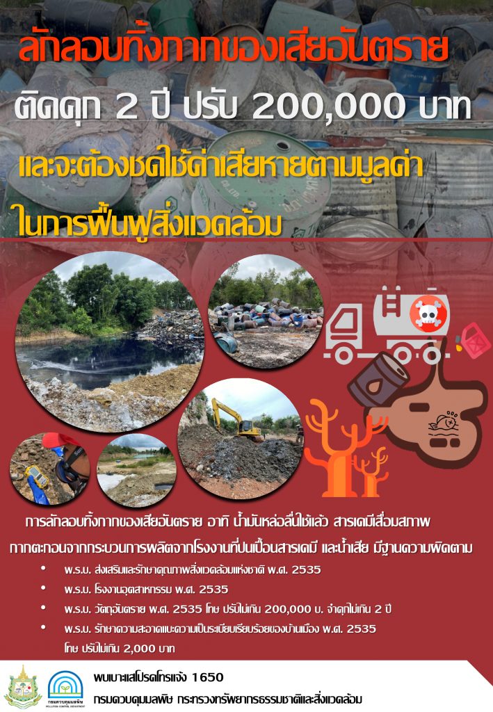 2. พระราชบัญญัติวัตถุอันตราย พ.ศ. 2535 และที่แก้ไขเพิ่มเติม คือความผิดฐานครอบครองวัตถุอันตรายชนิดที่ 1 หรือชนิดที่ 2 หรือชนิดที่ 3 โดยไม่ได้รับอนุญาต (มาตรา 21 มาตรา 22 มาตรา 23) ขึ้นอยู่กับว่ากากอุตสาหกรรมที่ตรวจพบเป็นวัตถุอันตรายชนิดใด ต้องระวางโทษสูงสุดไม่เกิน 2 ปี หรือปรับไม่เกิน 200,000 บาท หรือทั้งจำทั้งปรับ (มาตรา 70 หรือมาตรา 71 หรือมาตรา 72 หรือมาตรา 73)