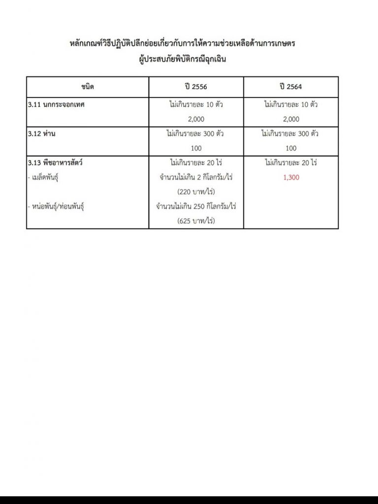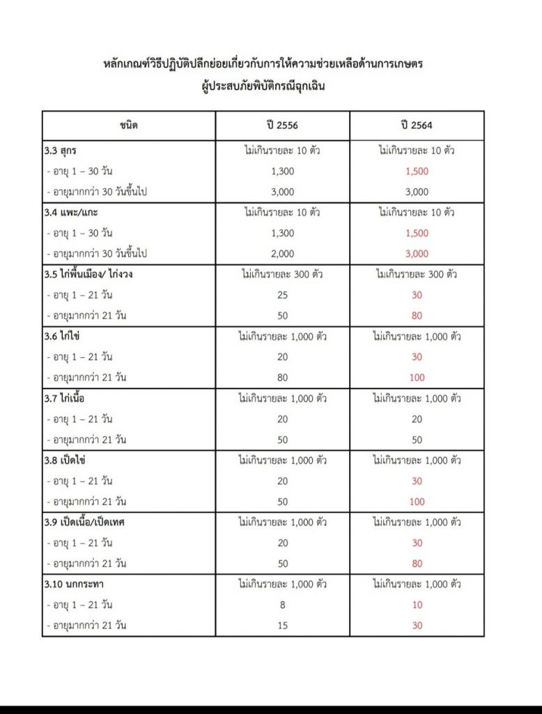 นายเฉลิมชัย ศรีอ่อน รัฐมนตรีว่าการกระทรวงเกษตรและสหกรณ์กล่าวว่า เกษตรกรที่ผลผลิตทางการเกษตรเสียหายจากอุทกภัยจะได้รับเงินเยียวยาในอัตราใหม่ ซึ่งเมื่อวันที่ 1 กันยายนที่ผ่านมา ประกาศเรื่อง หลักเกณฑ์วิธีปฏิบัติปลีกย่อยเกี่ยวกับการให้ความช่วยเหลือด้านการเกษตรผู้ประสบภัยพิบัติกรณีฉุกเฉิน พ.ศ. 2564 มีผลบังคับใช้ โดยด้านพืชเกษตรกรจะได้รับครัวเรือนละไม่เกิน 30 ไร่ แบ่งเป็น ข้าว ไร่ละ 1,340 บาท พืชไร่และพืชผัก ไร่ละ 1,980 บาท ไม้ผลไม้ยืนต้นและอื่นๆ ไร่ละ 4,048 บาท รวมถึงด้านปศุสัตว์และประมงก็ปรับเพิ่มขึ้นด้วย