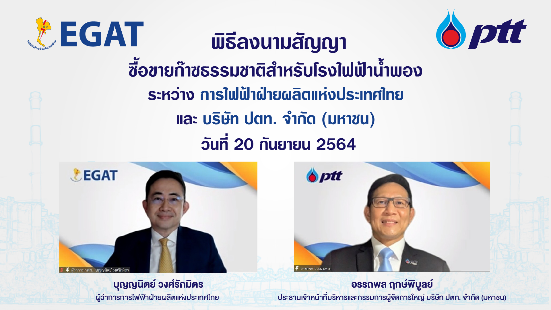 วันนี้ (20 ก.ย.) นายอรรถพล ฤกษ์พิบูลย์ ประธานเจ้าหน้าที่บริหารและกรรมการผู้จัดการใหญ่ บริษัท ปตท. จำกัด (มหาชน) (ปตท.) และ นายบุญญนิตย์ วงศ์รักมิตร ผู้ว่าการการไฟฟ้าฝ่ายผลิตแห่งประเทศไทย (กฟผ.) ร่วมลงนามสัญญาซื้อขายก๊าซธรรมชาติสำหรับโรงไฟฟ้าน้ำพองฉบับใหม่ ระยะเวลา 10 ปี (2564 – 2574) มูลค่ากว่า 53,000 ล้านบาท เสริมสร้างความมั่นคงทางพลังงาน เพิ่มขีดความสามารถการพัฒนาภาคตะวันออกเฉียงเหนือ พร้อมรองรับการขยายตัวทางเศรษฐกิจของประเทศ