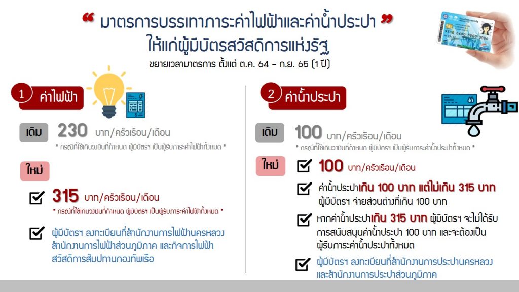 กรณีใช้เกินวงเงินที่กำหนด ผู้มีบัตรสวัสดิการฯ เป็นผู้รับภาระค่าไฟฟ้าทั้งหมด ครอบคลุม 1.9 ล้านครัวเรือน ส่วนการสนับสนุนค่าน้ำประปาวงเงิน 100 บาท /ครัวเรือน /เดือน ในกรณีใช้น้ำประปาเกิน 100 บาท แต่ไม่เกิน 315 บาท ยังคงได้รับการสนับสนุนในวงเงิน 100 บาท โดยส่วนเกินต้องชำระด้วยตนเอง และกรณีการใช้น้ำประปาเกิน 315 บาท ผู้มีบัตรฯ รับภาระในการชำระค่าน้ำประปาเองทั้งหมด ครอบคลุมประมาณ 186,625 ครัวเรือน
