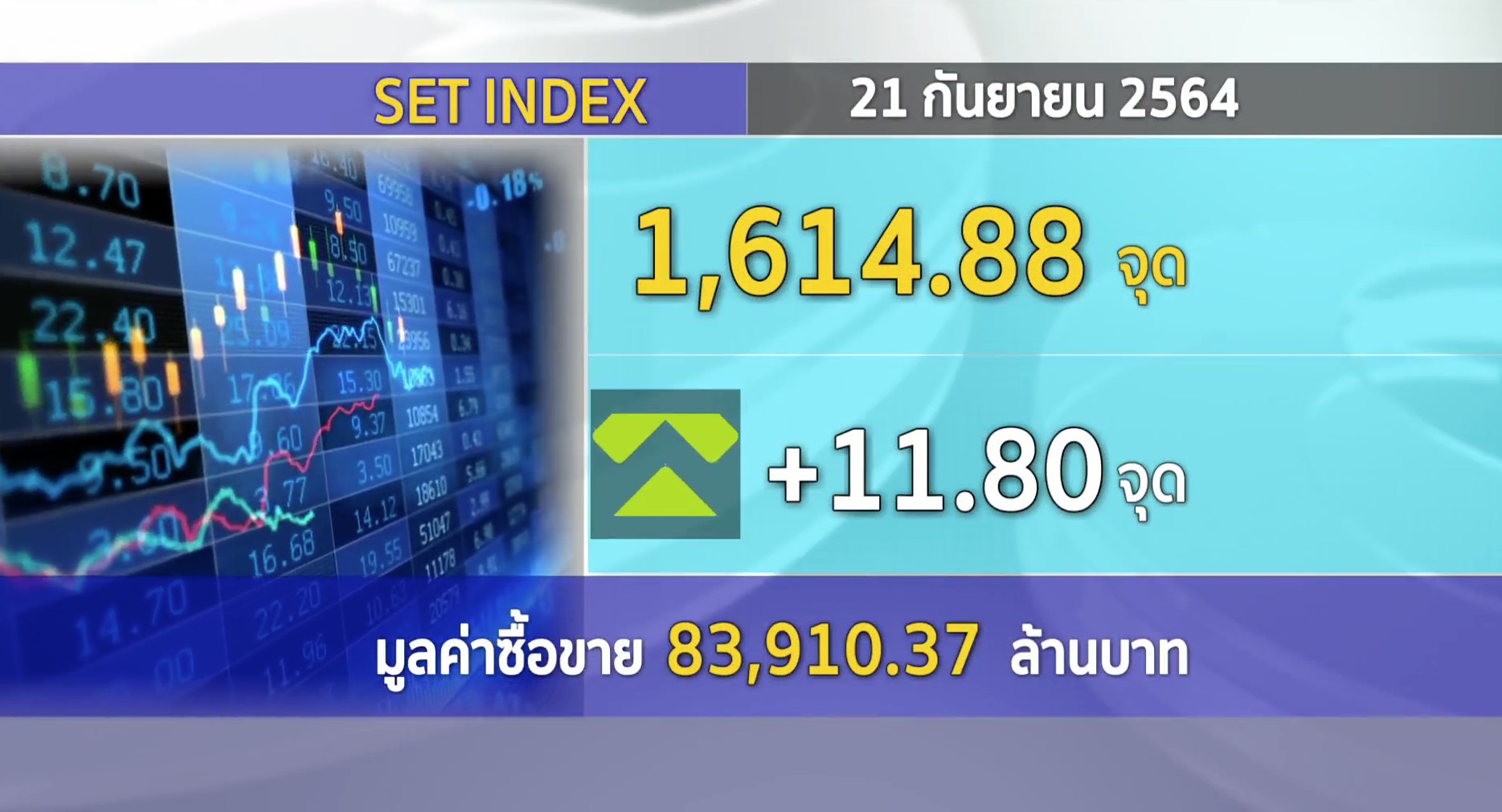 กทม. 21 ก.ย.-ตลาดหลักทรัพย์ ปิดวันนี้ที่ระดับ 1,614.86 จุด เพิ่มขึ้น 11.80 จุด (+0.74%) มูลค่าการซื้อขาย 83,910.37 ล้านบาท ฟื้นตัวแรงหลังคลายกังวลปัญหาเอเวอร์แกรนด์-ลุ้นประชุมเฟด