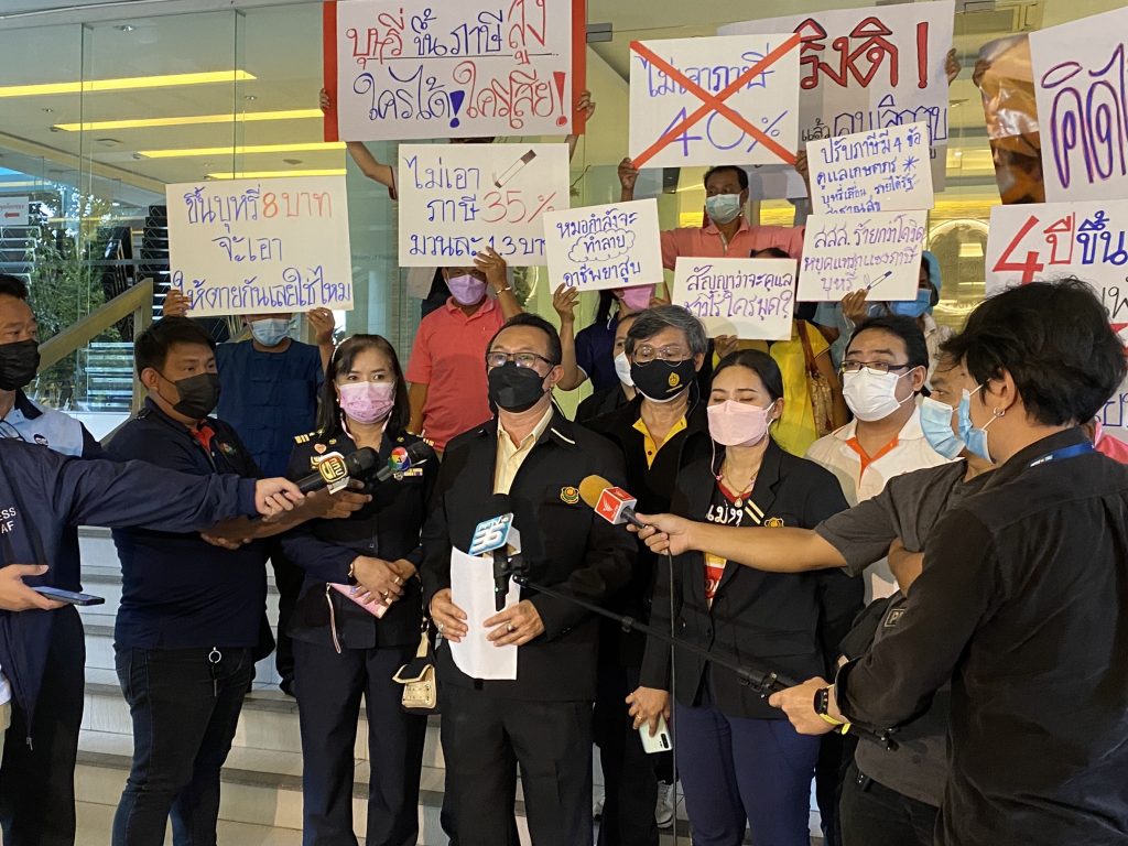 นายสุเทพ ทิมศิลป์ ประธานสหภาพแรงงานรัฐวิสาหกิจการยาสูบ สรย กล่าวว่า ในช่วงบ่ายวันนี้สหภาพยาสูบ – ชาวไร่ยาสูบกว่า 50 คน ได้ยื่นหนังสือรัฐมนตรีว่ากระทรวงการคลัง และรัฐมนตรีช่วยว่าการกระทรวงการคลังและอธิบดีกรมสรรพสามิต โดยมีตัวแทนข้าราชกระทรวงการคลังมารับหนังสือดังกล่าว เพื่อคัดค้านข้อเสนอเครือข่ายสุขภาพให้ขึ้นราคาบุหรี่ 8-10 บาทต่อซอง ที่คาดว่าจะเสนอต่อที่ประชุมคณะรัฐมนตรีพอจารณาเห็นชอบในสัปดาห์หน้าเพื่อหวังลดปริมาณคนสูบบุหรี่ให้น้อยลง แต่หากจะขึ้นตามข้อเสนอที่ทางกระทรวงสาธารณสุขมีความพยายามให้กระทรวงการคลังและกรมสรรพสามิตต่อไปอีก 4 ปี ก็เชื่อว่าจะเป็นการซ้ำเติมให้อุตสาหกรรมต่อเนื่องไปจนถึงเกษตรกรผู้ปลูกใบยาสูบภายในประเทศจะได้รับความเดือดร้อนเพิ่มขึ้นอย่างแน่นอน