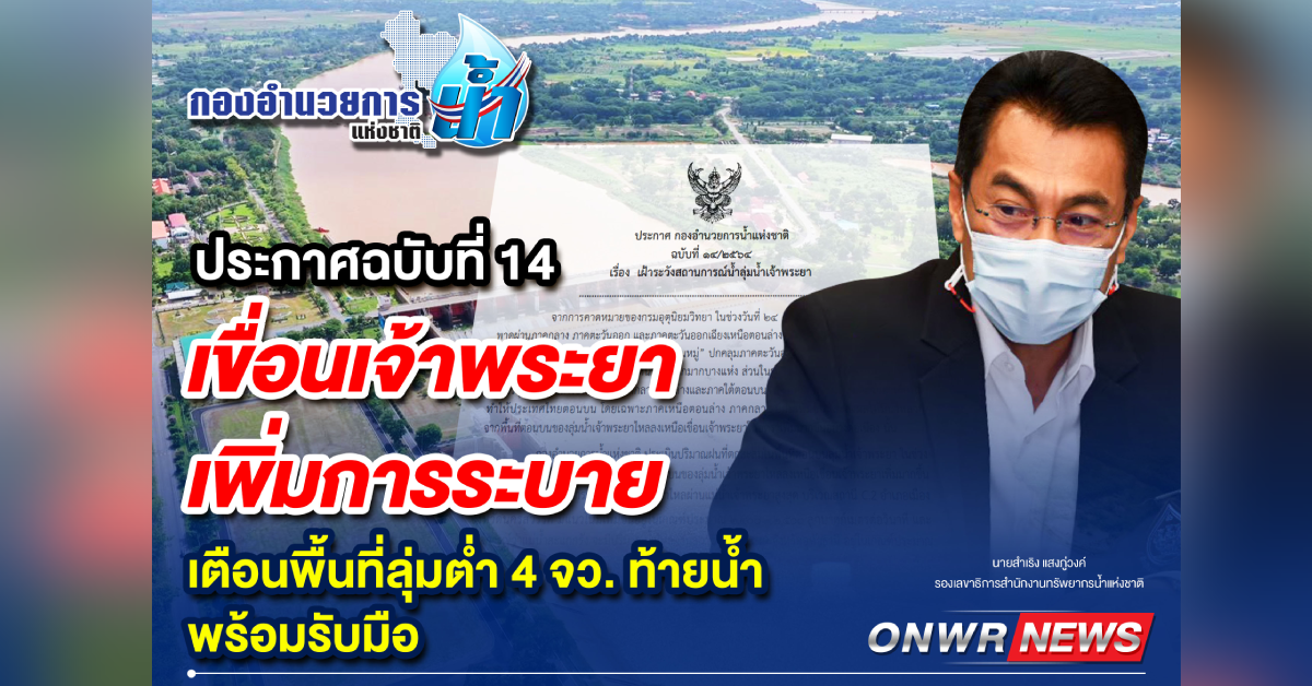 กรุงเทพฯ 25 ก.ย.-ประกาศฉบับที่ 14 เขื่อนเจ้าพระยาเพิ่มการระบายน้ำ เตือนพื้นที่ลุ่มต่ำ 4 จังหวัด ท้ายน้ำ พร้อมรับมือ
