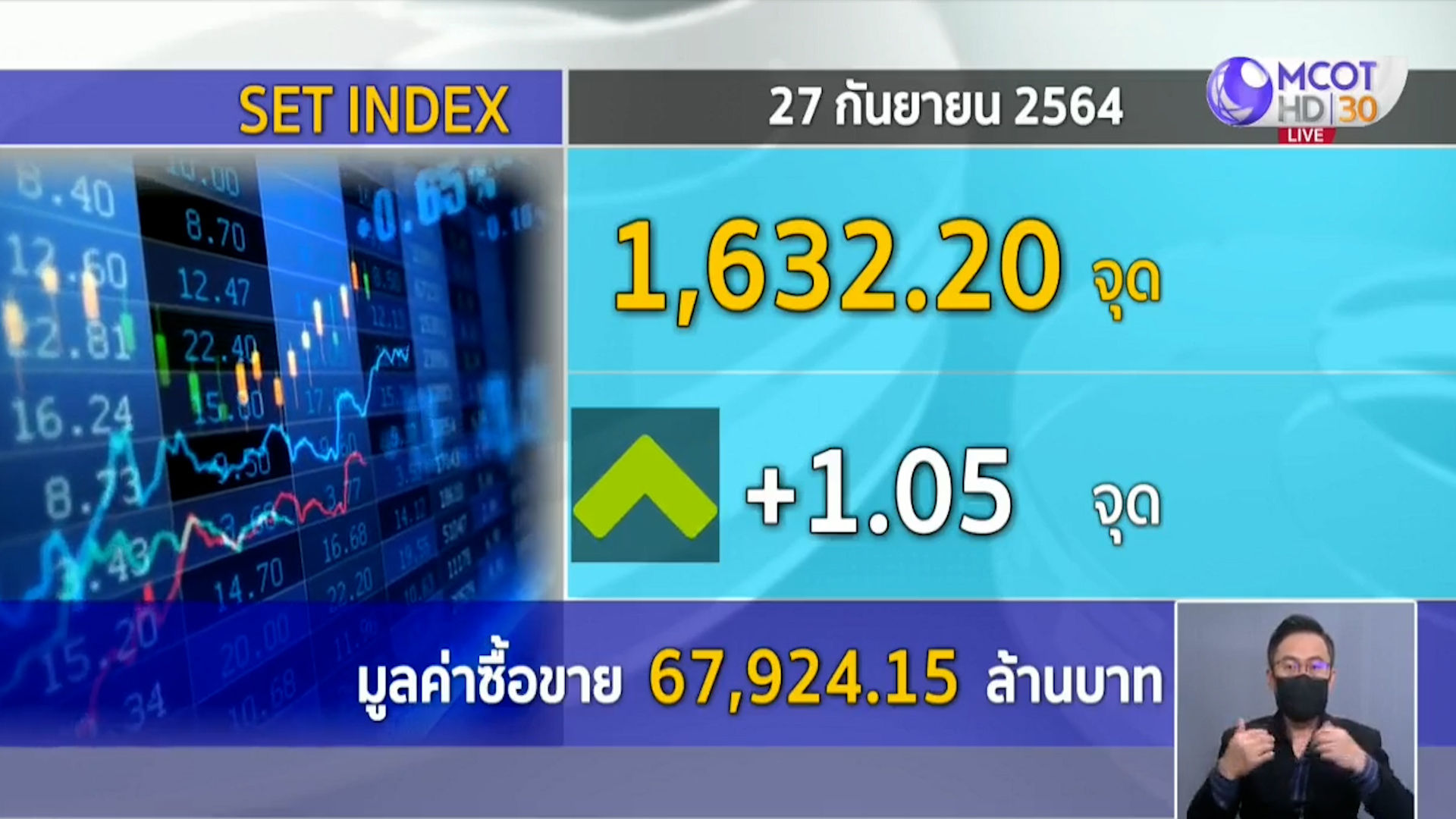 กทม 27 ก.ย.-ตลาดหุ้นไทยเคลื่อนไหวในกรอบแคบ ๆ แม้มีข่าวบวกจากหุ้นกลุ่มการเงินที่ปรับตัวสู่ดิจิทัลทางการเงิน แต่ก็มีความกังวลน้ำท่วมในหลายจังหวัดที่ฉุดให้เศรษฐกิจในประเทศชะลอตัว ดัชนีช่วงเที่ยงอยู่ที่ 1,632.20 จุด +1.05 จุด มูลค่าการซื้อขาย 67,924.15 ล้านบาท