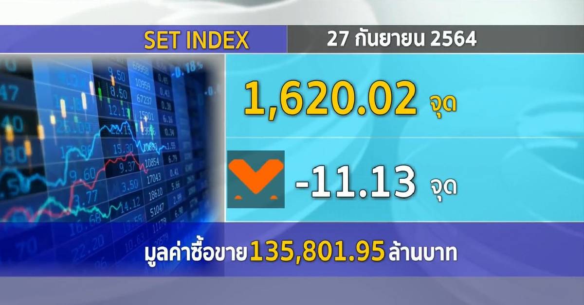 กทม. 27 ก.ย.-ตลาดหลักทรัพย์ ปิดวันนี้ที่ระดับ 1,620.02 จุด ลดลง 11.13 จุด (-0.68%) มูลค่าการซื้อขาย 135,801.95 ล้านบาท ขายทำกำไรระยะสั้น หลังปรับตัวขึ้นไปมากช่วงที่ผ่านมา กังวลน้ำท่วม