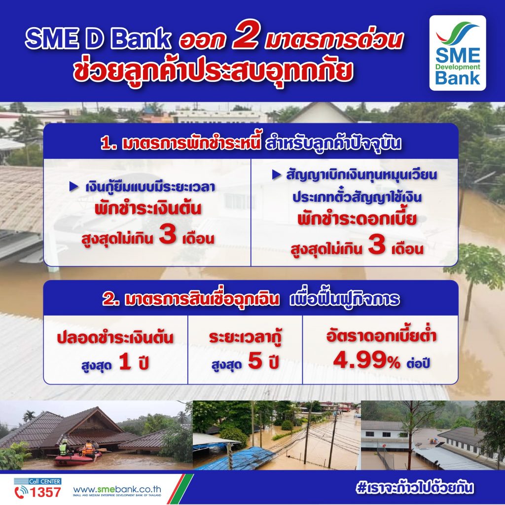 นางสาวนารถนารี รัฐปัตย์ กรรมการผู้จัดการ ธนาคารพัฒนาวิสาหกิจขนาดกลางและขนาดย่อมแห่งประเทศไทย (ธพว.) หรือ SME D Bank เปิดเผยว่า ตามที่หลายจังหวัดของประเทศไทย ทั้งภาคเหนือ ภาคกลาง ภาคอีสาน และภาคใต้ ได้รับผลกระทบจากอุทกภัย ฝนตกหนักอย่างต่อเนื่อง เกิดน้ำท่วมฉับพลัน น้ำป่าไหลหลาก ดินโคลนถล่ม และดินสไลด์ ส่งผลกระทบให้ผู้ประกอบธุรกิจในพื้นที่ดังกล่าว ประสบปัญหาทั้งทางตรงและทางอ้อมในการประกอบอาชีพ ธนาคารมีความห่วงใยเป็นอย่างยิ่ง จึงได้ออก 2 มาตรการเร่งด่วน ช่วยเหลือลูกค้าที่จะได้รับผลกระทบจากอุทกภัยในครั้งนี้ ได้แก่