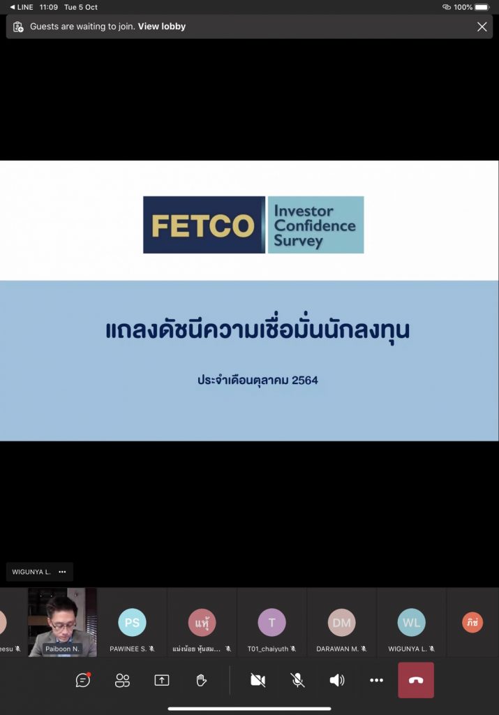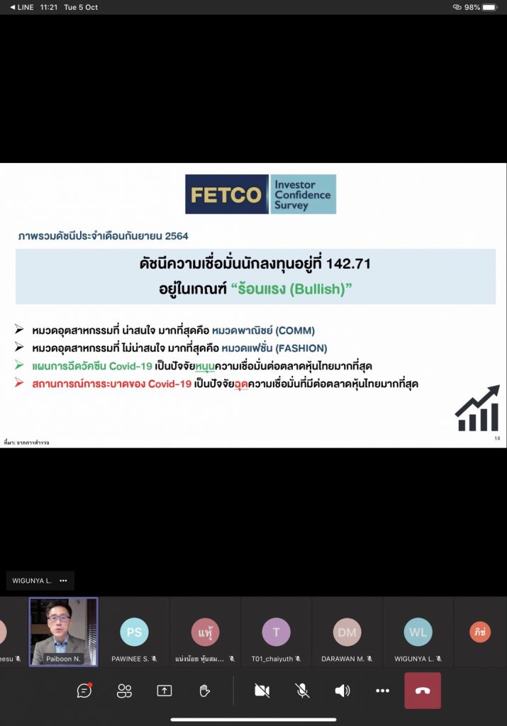 นายไพบูลย์ นลินทรางกูร ประธานกรรมการสภาธุรกิจตลาดทุนไทย เปิดเผยว่า ดัชนีความเชื่อมั่นนักลงทุน (FETCO Investor Confidence Index) ผลสำรวจในเดือน ก.ย.64 พบว่า ดัชนีความเชื่อมั่นนักลงทุน (FETCO Investor Confidence Index : ICI) ในอีก 3 เดือนข้างหน้า ปรับตัวลดลง 1.1% อยู่ที่ระดับ 142.71 อยู่ในเกณฑ์ “ร้อนแรง” เช่นเดียวกับเดือนก่อนหน้า