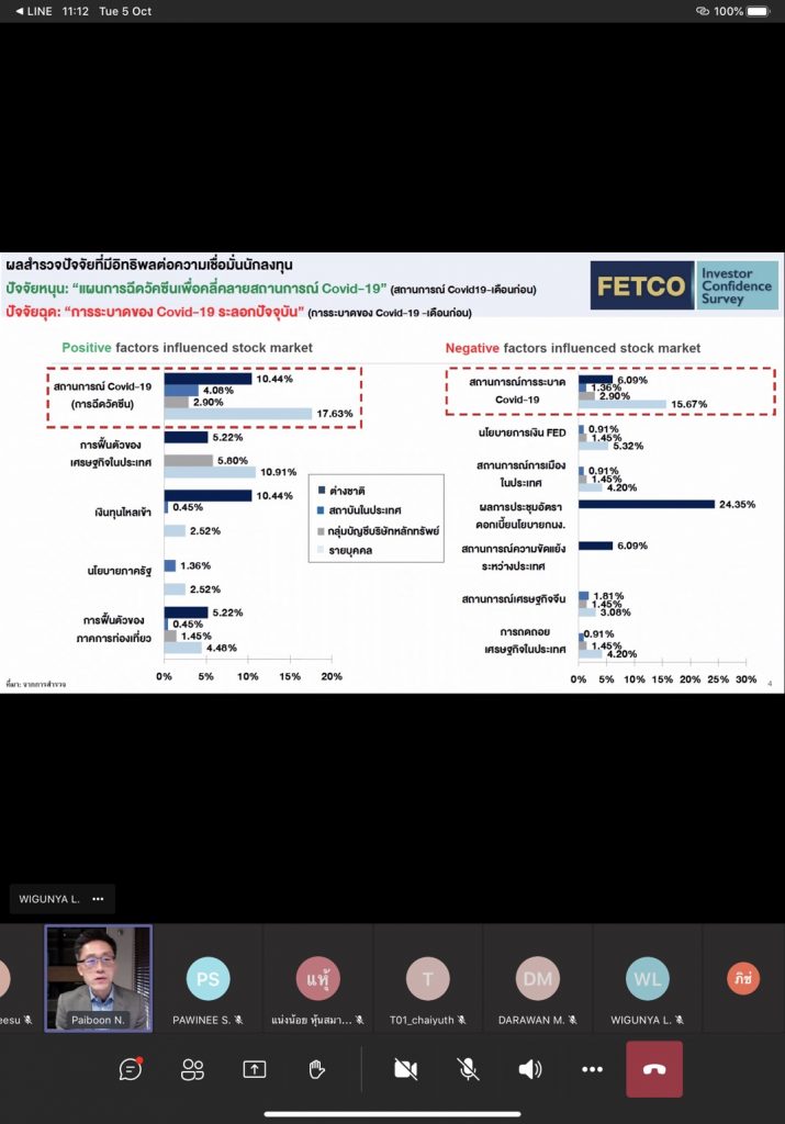 ทั้งนี้ นักลงทุนคาดหวังแผนการฉีดวัคซีนเพื่อคลี่คลายสถานการณ์โควิด-19 เป็นปัจจัยหนุนมากที่สุด รองลงมา คือ การฟื้นตัวของเศรษฐกิจในประเทศ และเงินทุนไหลเข้า สำหรับปัจจัยที่ฉุดความเชื่อมั่นนักลงทุนมากที่สุด ได้แก่ สถานการณ์ระบาดของโควิด-19 ระลอกปัจจุบัน รองลงมา คือ ผลการประชุมอัตราดอกเบี้ยนโยบายของคณะกรรมการนโยบายการเงิน (กนง.) และการประชุมคณะกรรมการกำหนดนโยบายการเงินของธนาคารกลางสหรัฐ (FED).-สำนักข่าวไทย