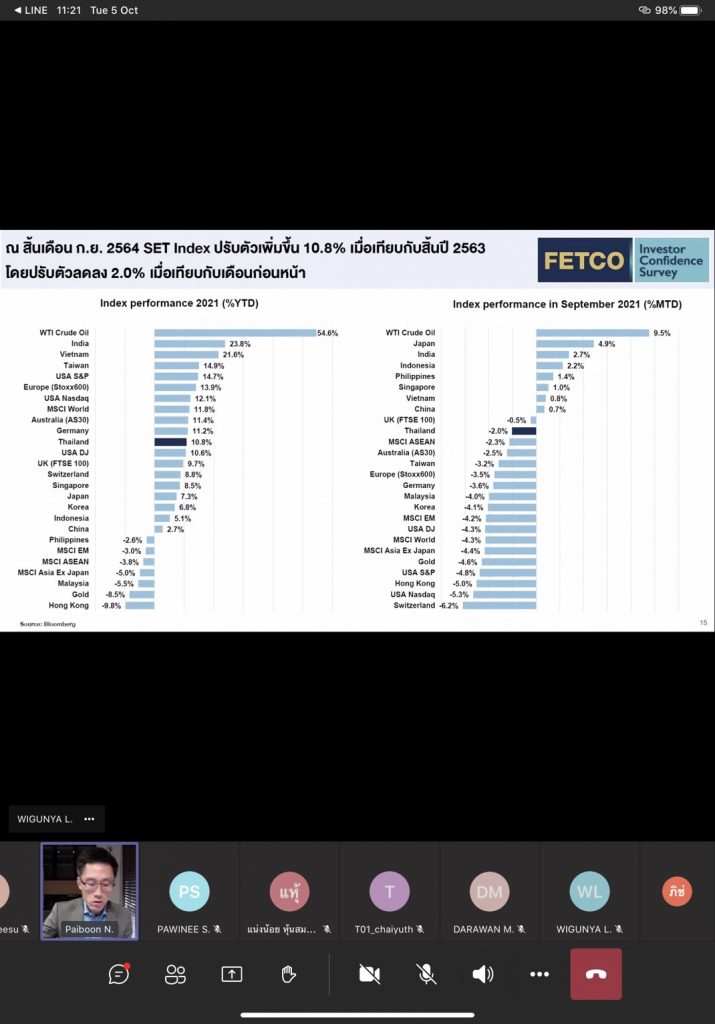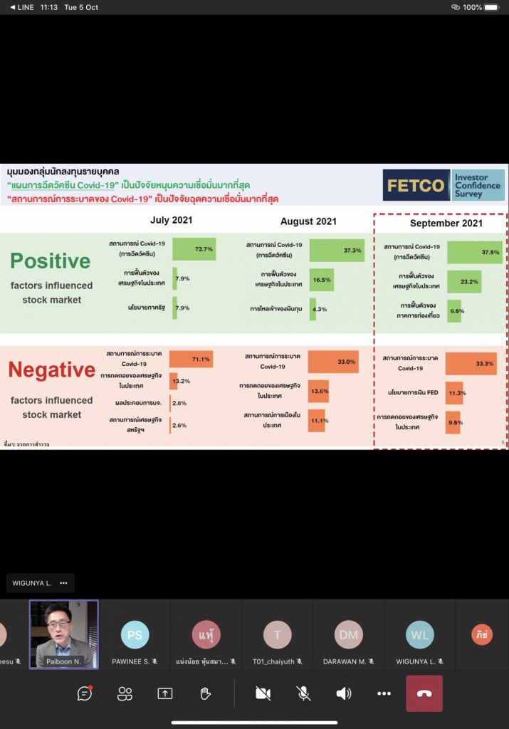 กรุงเทพฯ 5 ต.ค.-สภาธุรกิจตลาดทุนไทย ระบุดัชนีเชื่อมั่นนักลงทุนลด 1.1% แต่ยังเป็นเกณฑ์ร้อนแรง คาดหวังฉีดวัคซีนสถานการณ์โควิด-19 จะดีขึ้น