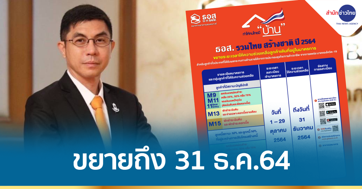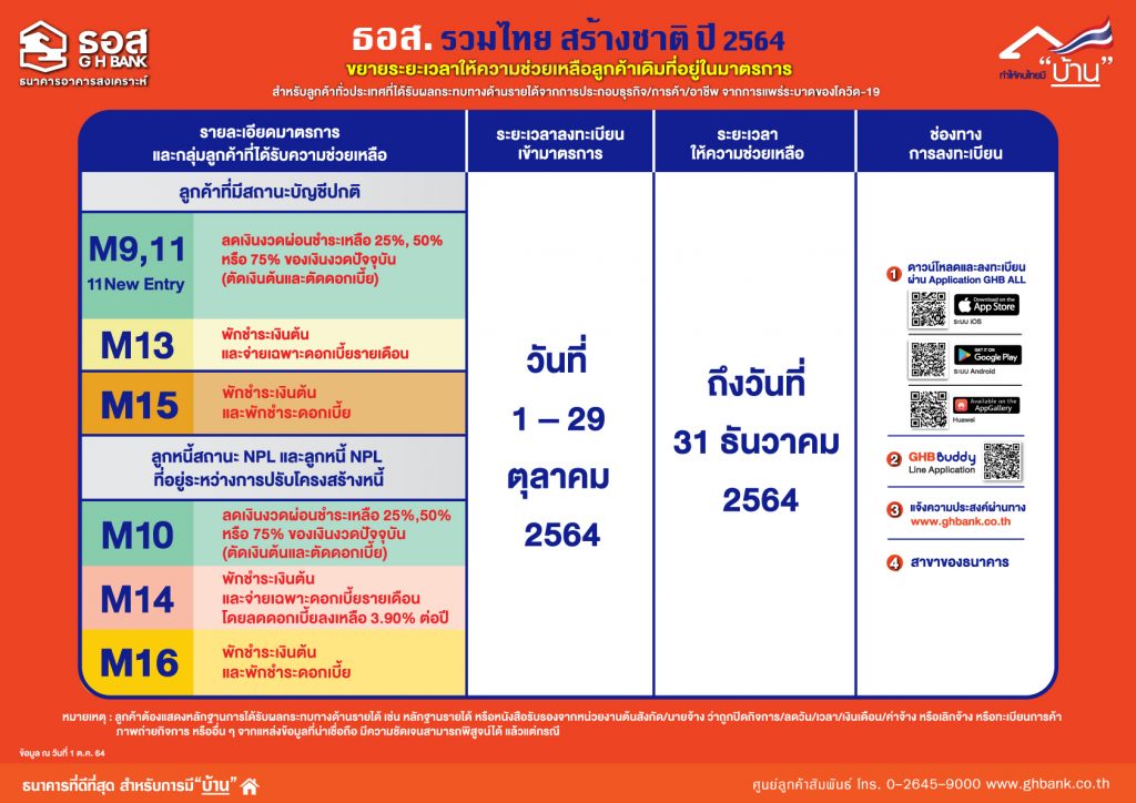 ธนาคารอาคารสงเคราะห์ ประกาศให้ลูกค้าเดิมที่อยู่ในมาตรการและยังคงได้รับผลกระทบด้านรายได้จาก COVID-19 ลงทะเบียนแจ้งความประสงค์เพื่อขอขยายระยะเวลาความช่วยเหลือผ่าน 8 มาตรการตาม “โครงการ ธอส. รวมไทย สร้างชาติ” ครอบคลุมทั้งการแบ่งจ่ายเงินงวดผ่อนชำระ (ตัดเงินต้น ตัดดอกเบี้ย) พักชำระเงินต้นและจ่ายเฉพาะดอกเบี้ย และพักชำระเงินต้นและพักชำระดอกเบี้ย ลงทะเบียนแจ้งความประสงค์ผ่าน Application : GHB ALL หรือ GHB Buddy บน Application Line ภายใน 29 ตุลาคม 2564