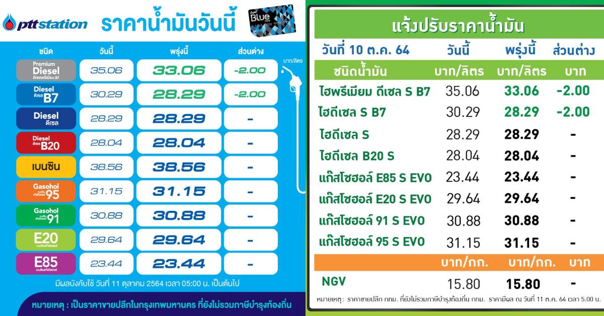 โดยราคาขายปลีกจะเป็นดังนี้ ULG = 38.56, GSH95 = 31.15, E20 = 29.64, GSH91 = 30.88, E85 = 23.44, HSD- B7= 28.29, HSD-B10 = 28.29, HSD-B20=28.04,ดีเซลพรีเมี่ยม B7 = 33.06 บาทต่อลิตร โดยราคาขายปลีกข้างต้นยังไม่รวมภาษีบำรุงกรุงเทพมหานคร