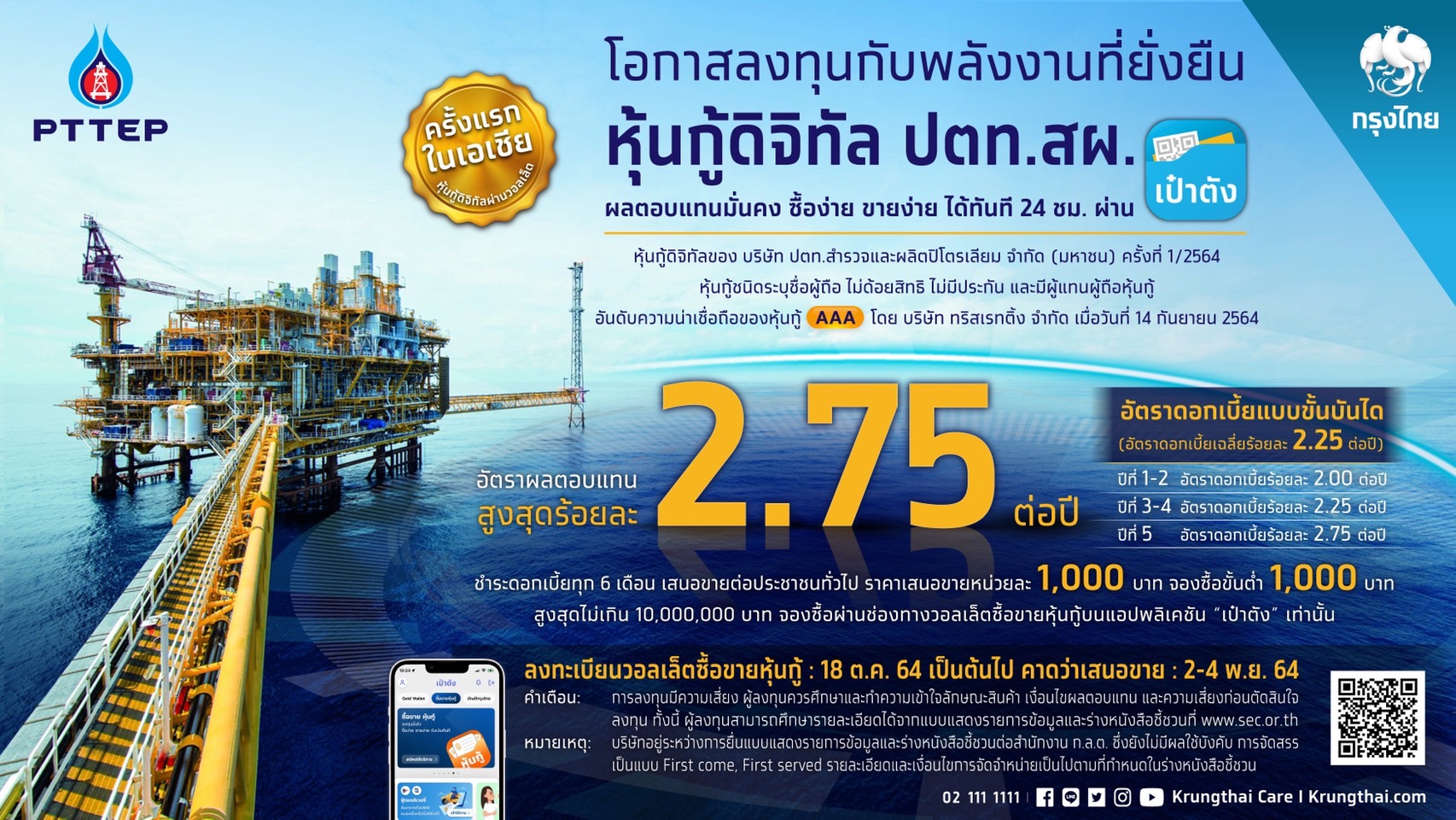 นายมนตรี ลาวัลย์ชัยกุล ประธานเจ้าหน้าที่บริหาร บริษัท ปตท.สำรวจและผลิตปิโตรเลียม จำกัด (มหาชน) หรือ ปตท.สผ. เปิดเผยว่า ปตท.สผ. มีแผนที่จะเสนอขายหุ้นกู้ให้กับประชาชนทั่วไปในตลาดทุนไทย โดยได้ร่วมมือกับธนาคารกรุงไทย ให้บริการซื้อขายหุ้นกู้ครั้งนี้ผ่านแอปพลิเคชัน ”เป๋าตัง” ถือเป็นการซื้อขายหุ้นกู้ด้วยระบบดิจิทัลวอลเล็ต เต็มรูปแบบครั้งแรกในเอเชีย เพื่อเป็นการเปิดโอกาสให้นักลงทุนรายย่อยมีโอกาสเข้าถึงการลงทุนกับ ปตท.สผ. ซึ่งเป็นบริษัทสำรวจและผลิตปิโตรเลียมชั้นนำของประเทศไทย หุ้นกู้ดิจิทัล ปตท.สผ. จึงเปิดให้ลงทุนขั้นต่ำเพียง 1,000 บาท ซึ่งเป็นมูลค่าลงทุนเริ่มต้นที่ต่ำที่สุดของการขายหุ้นกู้ในประเทศ บริษัทคาดว่าจะสามารถกำหนดมูลค่าการเสนอขายหุ้นกู้ทั้งหมดได้ในช่วงปลายเดือนตุลาคมนี้ และคาดว่าจะเปิดการเสนอขายหุ้นกู้ได้ในระหว่างวันที่ 2-4 พฤศจิกายน 2564