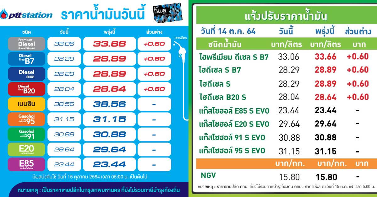 กทม. 14 ต.ค.-PTT Station ปรับราคาขายปลีกน้ำมันกลุ่มดีเซลทุกชนิดขึ้น 0.60 บาทต่อลิตร ส่วนกลุ่มเบนซินและแก๊สโซฮอล์ทุกชนิด คงเดิม มีผล 15 ต.ค.64 เวลา 05.00 น. เป็นต้นไป
