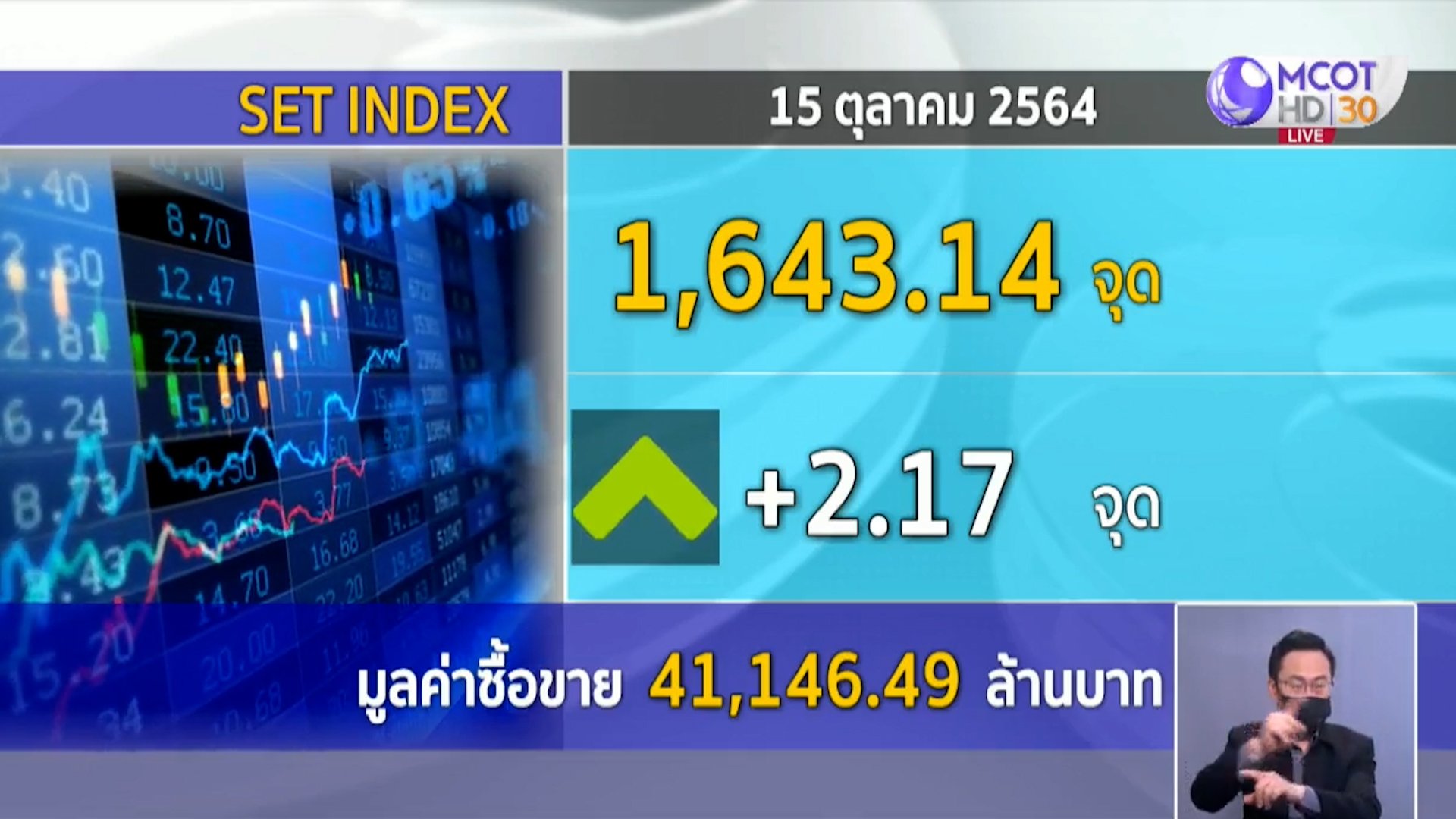 กทม. 15 ต.ค.-ตลาดหุ้นไทยช่วงเช้า ดัชนีขยับขึ้นตามตลาดหุ้นในภูมิภาคและแรงซื้อหุ้นจากข่าวเปิดเมือง 1 พ.ย. การผ่อนคลายล็อกดาวน์ รวมทั้งราคาน้ำมันที่ยังอยู่ระดับสูง ดัชนีช่วงเที่ยงอยู่ที่ 1,643.14 จุด +2.17 จุด มูลค่าการซื้อขาย 41,146.49 ล้านบาท