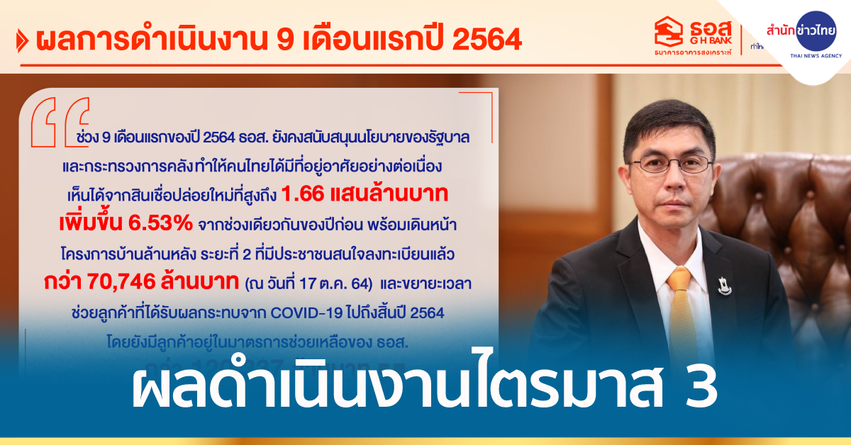 นายฉัตรชัย ศิริไล กรรมการผู้จัดการ ธนาคารอาคารสงเคราะห์ (ธอส.) เปิดเผยถึงผลการดำเนินงาน ณ ไตรมาสที่ 3 ของปี 2564 ว่าแม้สถานการณ์การแพร่ระบาดของเชื้อไวรัสโคโรนา 2019 (COVID-19) จะส่งผลกระทบต่อเศรษฐกิจ และรายได้ของประชาชน แต่ ธอส. ในฐานะสถาบันการเงินของรัฐ ที่มีพันธกิจ “ทำให้คนไทยมีบ้าน” ยังคงสนับสนุนนโยบายของรัฐบาล และกระทรวงการคลัง ในการยกระดับคุณภาพชีวิต และความมั่นคงในด้านที่อยู่อาศัยให้กับประชาชน ณ วันที่ 30 กันยายน 2564 ธอส. สามารถปล่อยสินเชื่อใหม่ได้จำนวน 166,173 ล้านบาท 117,802 บัญชี เพิ่มขึ้น 6.53% จากช่วงเดียวกันของปี 2563 คิดเป็น 77.06% ของเป้าหมายสินเชื่อปล่อยใหม่ปี 2564 ที่ 215,641 ล้านบาท ณ สิ้นไตรมาสที่ 3/2564 ธนาคารมียอดสินเชื่อคงค้างรวมทั้งสิ้น 1,408,857 ล้านบาท เพิ่มขึ้น 5.66% จาก ณ สิ้นปี 2563 สินทรัพย์รวม 1,455,358 ล้านบาท เพิ่มขึ้น 3.42% เงินฝากรวม 1,231,713 ล้านบาท เพิ่มขึ้น 6.03% หนี้ที่ไม่ก่อให้เกิดรายได้ (NPL) จำนวน 63,723 ล้านบาท คิดเป็น 4.52% ของยอดสินเชื่อรวม เพิ่มขึ้นเล็กน้อยเมื่อเทียบกับตลาด (สิ้นปี 2563 ธอส.มี NPL อยู่ที่ 3.75%) โดยมีการตั้งสำรองเผื่อหนี้สงสัยจะสูญเพื่อความมั่นคงและเตรียมพร้อมรองรับผลกระทบจาก COVID-19 ที่อาจเกิดขึ้นในอนาคตที่ 108,201 ล้านบาท คิดเป็นสัดส่วนต่อ NPL สูงถึง 169.80% โดยยังคงมีกำไรสุทธิตามตัวชี้วัดของธนาคารที่ 8,966 ล้านบาท และมีอัตราส่วนเงินกองทุนต่อสินทรัพย์เสี่ยง (BIS Ratio) อยู่ที่ระดับแข็งแกร่ง โดย ณ เดือนสิงหาคม 2564 อยู่ที่ 15.36% สูงกว่าอัตราเงินกองทุนขั้นต่ำที่ธนาคารแห่งประเทศไทย (ธปท.) กำหนดที่ 8.50% ทั้งนี้ ปัจจัยหลักที่ทำให้ธนาคารปล่อยสินเชื่อได้อย่างต่อเนื่องยังคงเกิดจากความต้องการของประชาชนที่ต้องการมีที่อยู่อาศัยด้วยผลิตภัณฑ์สินเชื่ออัตราดอกเบี้ยต่ำของ ธอส.และมีปัจจัยเสริมจากการจัดโปรโมชันต่าง ๆ ของผู้ประกอบการ ทำให้ต้นทุนในการมีที่อยู่อาศัยของประชาชนต่ำลง รวมทั้งนโยบายต่าง ๆ ของรัฐบาลที่ออกมาช่วยเหลือประชาชน ทั้งนี้ ธอส. ยังคงเป็นผู้นำในตลาดด้วยการครอง ส่วนแบ่งตลาดสินเชื่อที่อยู่อาศัยคงค้างกว่า 31.4% และมั่นใจว่า ณ สิ้นปี 2564 การปล่อยสินเชื่อใหม่จะเป็นไปตามเป้าหมาย 215,641 ล้านบาท