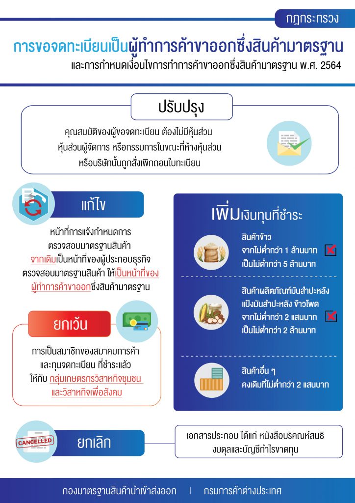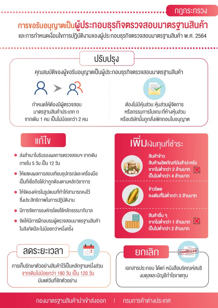 ทั้งนี้ กฎกระทรวงทั้ง 4 ฉบับ มีเป้าหมายในการส่งเสริมการค้าสินค้ามาตรฐานทั้ง 9 สินค้า (ข้าวหอมมะลิไทย แป้งมันสำปะหลัง ผลิตภัณฑ์มันสำปะหลัง ข้าวโพด ข้าวฟ่าง ปุยนุ่น ถั่วเขียว ถั่วเขียวผิวดำ และปลาป่น) และยกระดับการตรวจสอบมาตรฐานสินค้าตามมาตรฐานสากล ซึ่งในสาระสำคัญของกฎกระทรวงแต่ละฉบับ กรมการค้าต่างประเทศได้ปรับปรุงรายละเอียดให้แนวทางปฏิบัติมีความชัดเจนและลดขั้นตอนการดำเนินงานที่ไม่จำเป็นตลอดจนสอดคล้องกับบริบทการดำเนินธุรกิจในปัจจุบัน รวมถึงยกระดับการให้บริการด้วยระบบอิเล็กทรอนิกส์เพื่ออำนวยความสะดวกและเปิดประตูสู่โอกาสทางการค้าให้กับกลุ่มเกษตรกร วิสาหกิจชุมชน และวิสาหกิจเพื่อสังคมในระดับท้องถิ่นได้ก้าวสู่ตลาดต่างประเทศมากยิ่งขึ้น ไม่ว่าจะเป็นการยกเลิกการยื่นเอกสารประกอบการขอจดทะเบียน/ขอรับอนุญาต หรือการต่ออายุบางรายการ การยกเว้นค่าธรรมเนียมคำร้องขอและค่าแบบพิมพ์คำร้องขอ และการปรับปรุงเงื่อนไขการปฏิบัติงาน เพื่อมุ่งขจัดความเหลื่อมล้ำของการให้บริการภาครัฐ ทั้งนี้ เพื่อเสริมสร้างให้การส่งออกสินค้ามาตรฐานของไทยขยายตัวอย่างต่อเนื่อง มีคุณภาพมาตรฐานเป็นที่ยอมรับในตลาดต่างประเทศ และสามารถแข่งขันได้ในเวทีระดับโลก