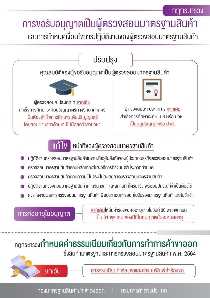 - กฎกระทรวงการขอรับอนุญาตเป็นผู้ประกอบธุรกิจตรวจสอบมาตรฐานสินค้าและการกำหนดเงื่อนไขการปฏิบัติงานของผู้ประกอบธุรกิจตรวจสอบมาตรฐานสินค้า พ.ศ. 2564