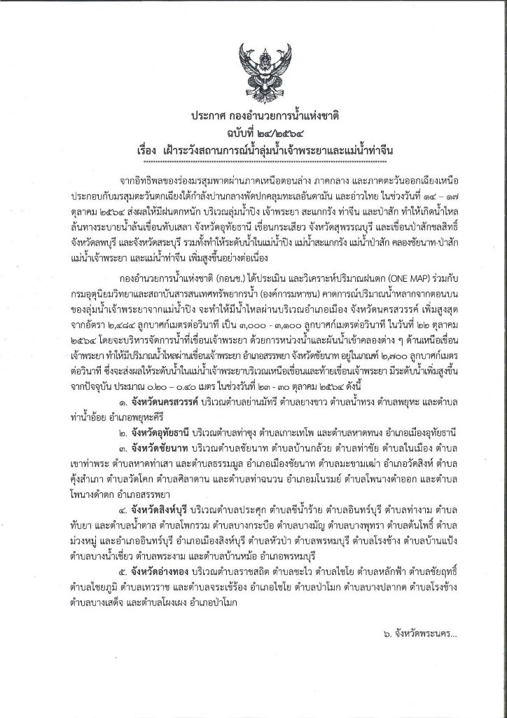 สำนักข่าวไทย 18 ต.ค.- กอนช. ออกประกาศฉบับที่ 24 เฝ้าระวังสถานการณ์น้ำลุ่มน้ำเจ้าพระยาและแม่น้ำท่าจีน