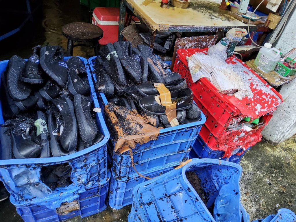 ทั้งนี้ การตรวจสอบสารเคมีตกค้าง คพ.ดำเนินการร่วมกับกรมสวัสดิการคุ้มครองแรงงาน โดยมีนายโกศล ชูแก้ว ผู้จัดการโรงงานดังกล่าว นำตรวจสอบและให้ข้อมูลว่า เป็นโรงงานผลิตรองเท้าหนังและผ้าใบ กำลังการผลิต 3,000-5,000 คู่/วัน พนักงาน 120 คน วัตถุดิบที่ใช้ในกระบวนการผลิตต่อเดือน ประกอบด้วย หนังแท้ 1-2 ตัน เรซินประมาณ 500 กิโลกรัม กาวลาเท็กซ์ 60-100 ลิตร ทินเนอร์ ปริมาณ 20 ลิตร เม็ดพลาสติกพีวีซี 1 ตัน ทั้งนี้ โรงงานมีไลน์เครื่องฉีดเครื่องอัดทำรองเท้าได้รับความเสียหายจากเพลิงไหม้ทั้งหมด โดยในขณะตรวจสอบเพลิงดับสนิทลงแล้ว