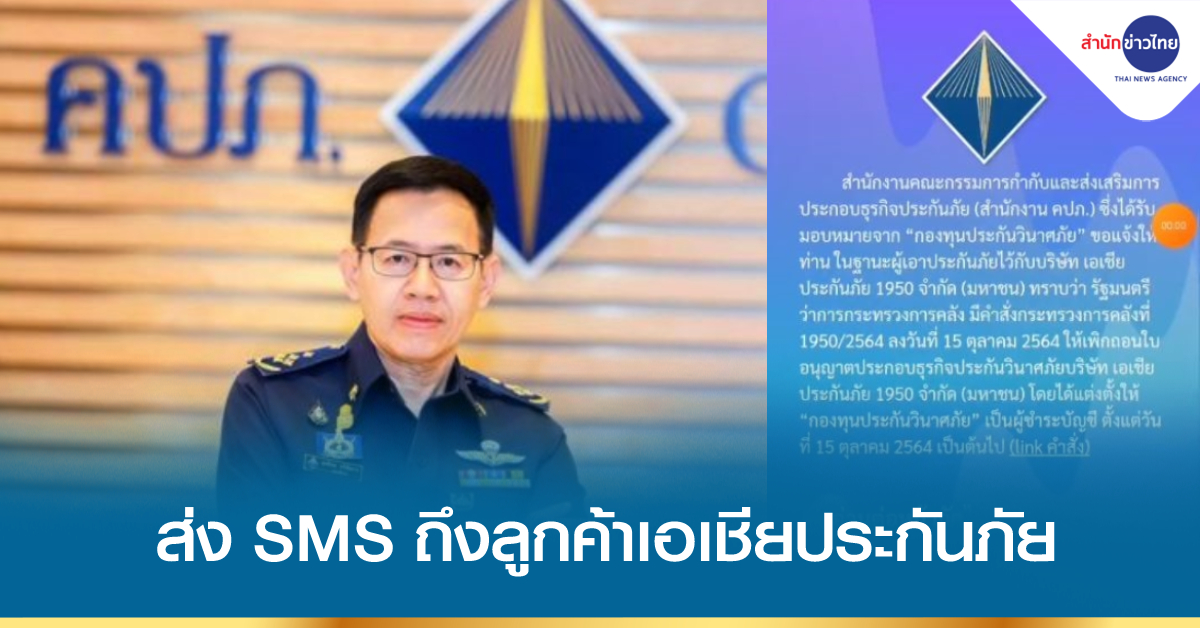 กรุงเทพฯ 22 ต.ค. – คปภ.ส่ง SMS ถึงผู้เอาประกันภัยของบริษัท เอเชียประกันภัย ที่ถูกเพิกถอนใบอนุญาตประกอบธุรกิจประกันวินาศภัย เพื่อให้สามารถใช้สิทธิผ่าน Web Application ในการขอคืนเบี้ยประกันภัย หรือเปลี่ยนแปลงกรมธรรม์ได้รวดเร็วขึ้น