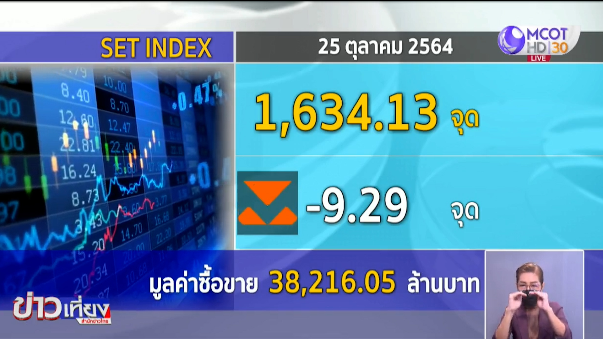 กทม. 25 ต.ค.- หุ้นไทย ล่าสุดเคลื่อนไหวแดนลบ ดัชนีอยู่ที่ 1,634.13 จุด -9.29 จุด มูลค่าการซื้อขาย 38,216.05 ล้านบาท แม้จะมีปัจจัยบวกเปิดประเทศของไทย แต่จากคำเตือนเรื่องเงินเฟ้อ ก็กดดันตลาดที่มองว่าจะส่งผลให้นโยบายการเงินทั่วโลกอาจเปลี่ยนเปลงเร็วกว่าที่ตลาดคาด