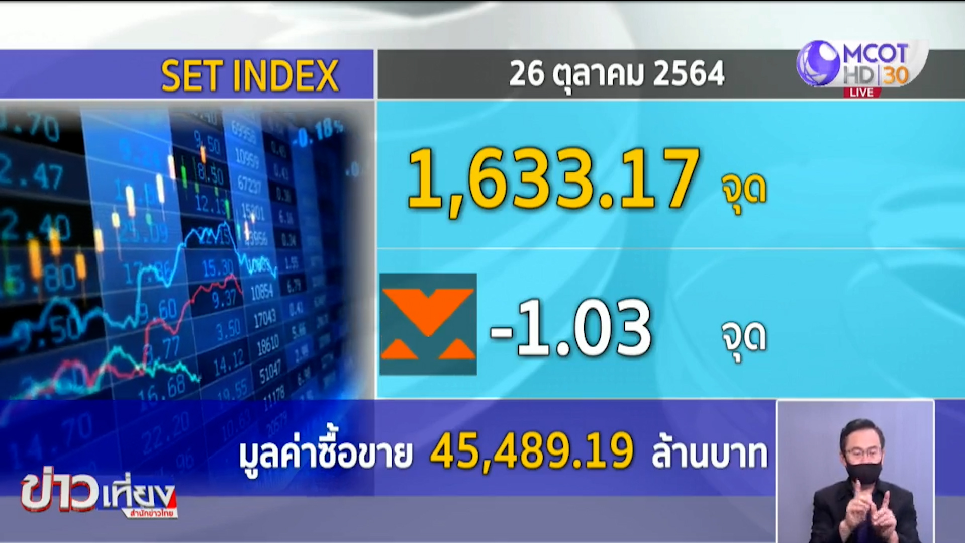 กทม. 26 ต.ค.-หุ้นไทยเช้านี้ แม้เปิดบวก ด้วยหุ้นกระแสเปิดเมือง แต่ล่าสุดมีแรงขายทำกำไร ขณะที่ดัชนีช่วงเที่ยงเคลื่อนไหวอยู่ที่ 1,633.17 จุด -1.03 จุด มูลค่าการซื้อขาย 45,489.19 ล้านบาท