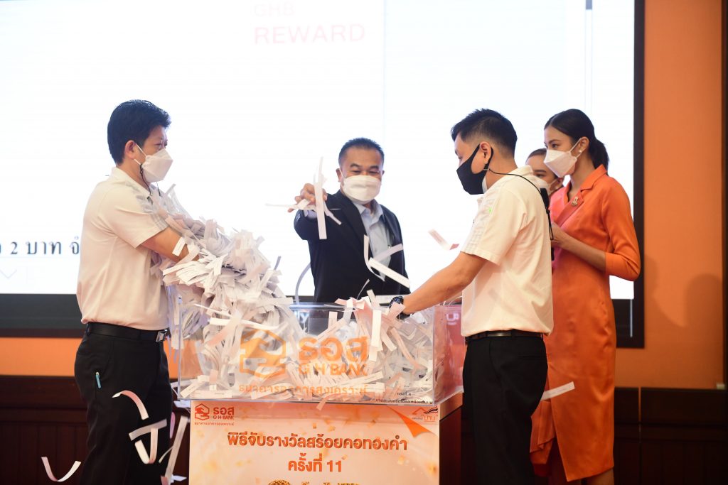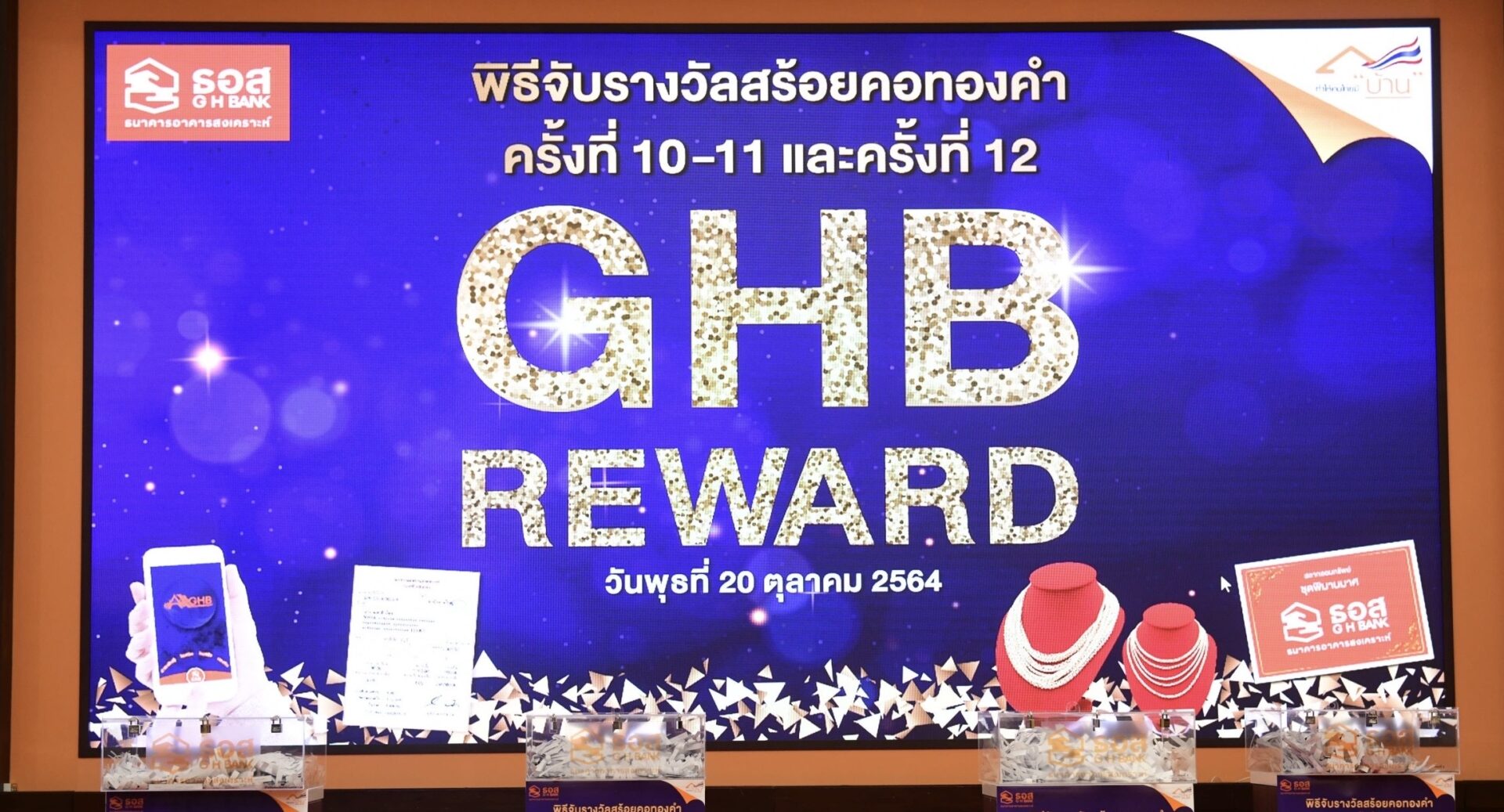 นายวิทยา แสนภักดี รองกรรมการผู้จัดการ กลุ่มงานการตลาด ธนาคารอาคารสงเคราะห์ (ธอส.) เป็นประธาน การจับรางวัลสร้อยคอทองคำ “โครงการ GHB Reward ครั้งที่ 10 ครั้งที่ 11 และครั้งที่ 12” จำนวน 162 รางวัล มูลค่ารวมกว่า 5.2 ล้านบาท ประกอบด้วย รางวัลที่ 1 สร้อยคอทองคำหนัก 2 บาท จำนวน 42 รางวัล รางวัลที่ 2 สร้อยคอทองคำหนัก 1 บาท จำนวน 120 รางวัล โดยมีผู้แทนจากหน่วยงานภาครัฐ และสื่อมวลชน ร่วมเป็นสักขีพยาน
