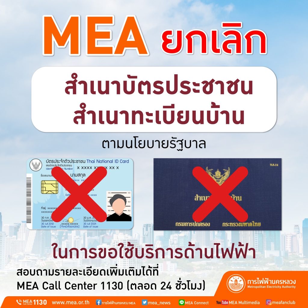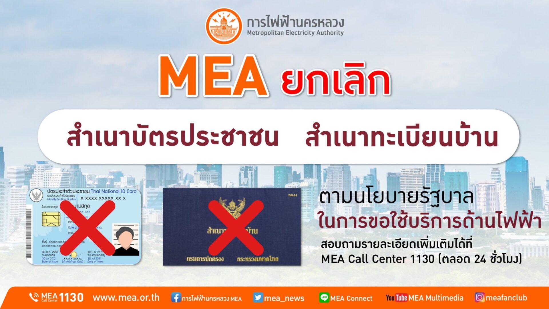 การไฟฟ้านครหลวง หรือMEAแจ้งว่าในฐานะรัฐวิสาหกิจสังกัดกระทรวงมหาดไทย ที่ให้บริการจำหน่ายกระแสไฟฟ้าในพื้นที่กรุงเทพมหานคร นนทบุรี และสมุทรปราการ ได้ดำเนินการตามนโยบายรัฐบาลอำนวยความสะดวกแก่ประชาชน ตามมติของคณะกรรมการขับเคลื่อนการปฏิรูปเพื่อรองรับการปรับเปลี่ยนตามนโยบาย Thailand 4.0 ครั้งที่ 1/2561 เมื่อวันที่ 30 เมษายน 2561 ที่ผ่านมา ที่มีมติให้ยกเลิกการใช้สำเนาบัตรประจำตัวประชาชนและสำเนาทะเบียนบ้านในที่ทำการของ MEA เพื่อรองรับในการเป็นรัฐบาลดิจิทัล (Digital Government)