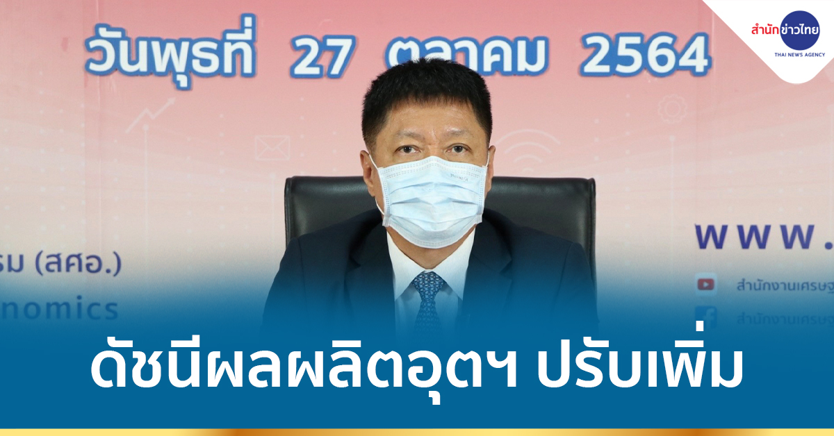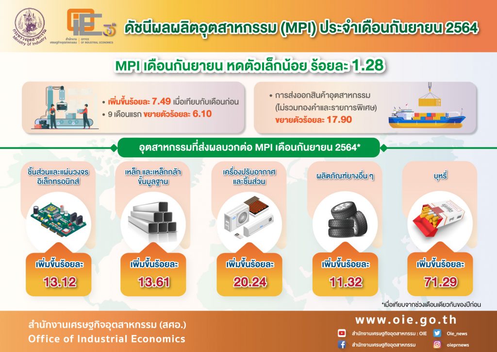 นายทองชัย ชวลิตพิเชฐ ผู้อำนวยการสำนักงานเศรษฐกิจอุตสาหกรรม (สศอ.) กล่าวว่า ดัชนีผลผลิตอุตสาหกรรม (MPI) เดือนกันยายน อยู่ที่ระดับ 93.72 หดตัวลงเล็กน้อยร้อยละ 1.28 เมื่อเทียบกับเดือนเดียวกันของปีก่อน แต่เมื่อเทียบกับเดือนก่อนหน้าขยายตัวร้อยละ 7.49 โดย 9 เดือนแรกขยายตัวร้อยละ 6.10 โดยภาพรวมของอุตสาหกรรมหลักของประเทศขยายตัวเพิ่มขึ้นอย่างต่อเนื่อง สำหรับไตรมาส 3/2564 ดัชนีผลผลิตอุตสาหกรรมอยู่ที่ระดับ 90.43 จากสถานการณ์การติดเชื้อไวรัสโควิด-19 ของแรงงานในสถานประกอบการมีทิศทางที่ดีขึ้น สะท้อนจากดัชนีแรงงานอุตสาหกรรมเดือนกันยายนที่ปรับตัวดีขึ้น โดยดัชนีแรงงานในอุตสาหกรรมสำคัญหลายกลุ่มยังคงขยายตัว อาทิ ชิ้นส่วนอิเล็กทรอนิกส์ขยายตัวร้อยละ 10.85 แปรรูปผักผลไม้ขยายตัวร้อยละ 5.86 เครื่องปรับอากาศขยายตัวร้อยละ 9.76 และยางล้อขยายตัวร้อยละ 3.42 แต่อย่างไรก็ตาม การระบาดของเชื้อไวรัสโควิด-19 ทั้งในประเทศและต่างประเทศ ยังส่งผลต่อการขาดแคลนชิปและชิ้นส่วนรถยนต์บางรายการ แต่ในเดือนกันยายนสถานการณ์เริ่มคลี่คลายในทิศทางที่ดีขึ้นโดยโรงงานผลิตรถยนต์ได้รับส่งมอบชิปและชิ้นส่วนรถยนต์ได้มากขึ้น ด้านสถาบันการเงินเริ่มผ่อนคลายความเข้มงวดในการอนุมัติ ทำให้คาดว่ายอดขายรถยนต์ในประเทศน่าจะเป็นไปตามเป้าที่ตั้งไว้ตั้งแต่ต้นปีที่ 750,000 คัน ซึ่งจะส่งผลให้การผลิตขยายตัวต่อเนื่องตามกัน ขณะที่สถานการณ์น้ำท่วมที่เกิดขึ้นในหลายจังหวัดของประเทศ ไม่ส่งผลกระทบต่อการผลิตในภาคอุตสาหกรรมอย่างมีนัยสำคัญ แต่ทั้งนี้อาจส่งผลกระทบบ้างในด้านโลจิสติกส์ รวมถึงอุตสาหกรรมที่ต้องพึ่งพิงวัตถุดิบทางการเกษตรอาจจะได้รับผลกระทบบ้างในระยะถัดไป