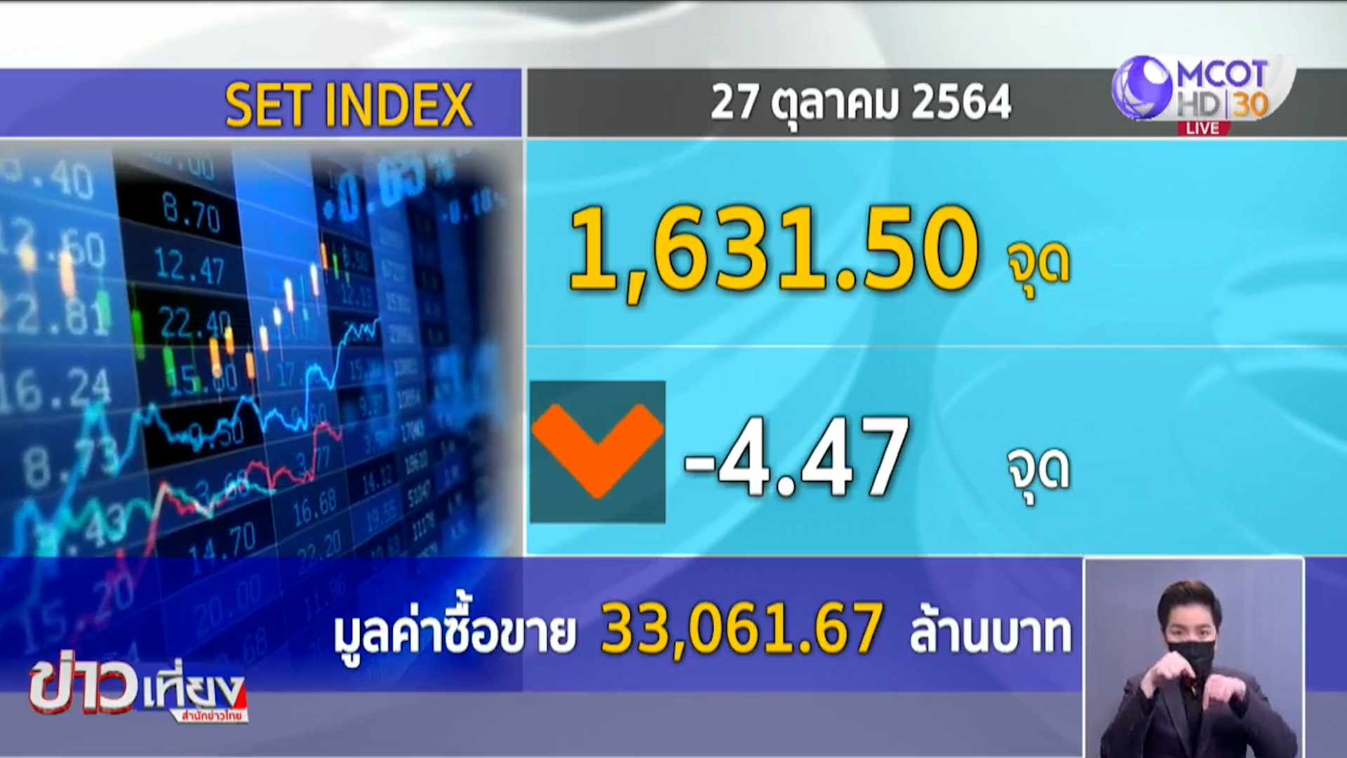 กทม. 27 ต.ค.-ตลาดหุ้นไทยช่วงเช้า ดัชนีแกว่งตัวแดนลบ แม้ราคาน้ำมันพุ่งขึ้นและแรงเก็งกำไรกลุ่มหุ้นบางกลุ่ม แต่ Fund flow ที่มีความผันผวน มีส่วนกดดันดัชนี ช่วงเที่ยงอยู่ที่ 1,631.50 จุด -4.47 จุด มูลค่าการซื้อขาย 33,061.67 ล้านบาท
