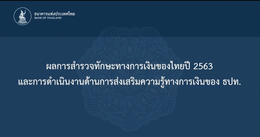 นางนวพร มหารักขกะ ผู้ช่วยผู้ว่าการสายบริหารความเสี่ยง ธนาคารแห่งประเทศไทย (ธปท.) เปิดเผยถึงผลสำรวจทักษะทางการเงินของไทย ปี 2563 ซึ่งทำต่อเนื่องมาตั้งแต่ปี 2545 โดยครั้งนี้เป็นครั้งที่ 8 สำรวจโดยสำนักงานสถิติแห่งชาติ จำนวน 11,901 ครัวเรือน พบว่า คนไทยมีระดับทักษะทางการเงินอยู่ที่ร้อยละ 71.0 สูงขึ้นจากปี 2559 และปี 2561 และสูงกว่าค่าเฉลี่ย OECD ที่ร้อยละ 60.5 และดีขึ้นทุกด้าน โดยมีระดับความรู้ทางการเงินอยู่ที่ร้อยละ 62.9 พฤติกรรมทางการเงินอยู่ที่ร้อยละ 71.1 และทัศนคติทางการเงินอยู่ที่ร้อยละ 82.0